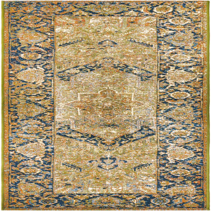 A 6 ft runner rug featuring a distressed traditional medallion pattern in greens, navy blue, and orange, suitable for a hallway or patio.