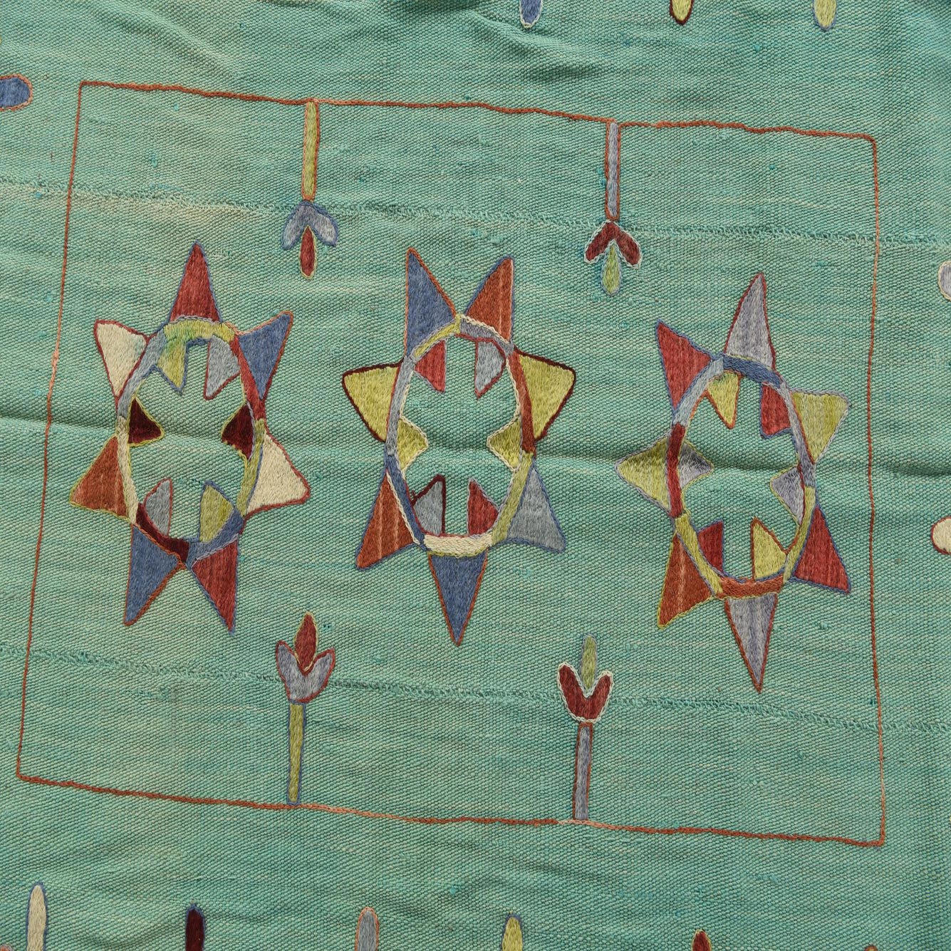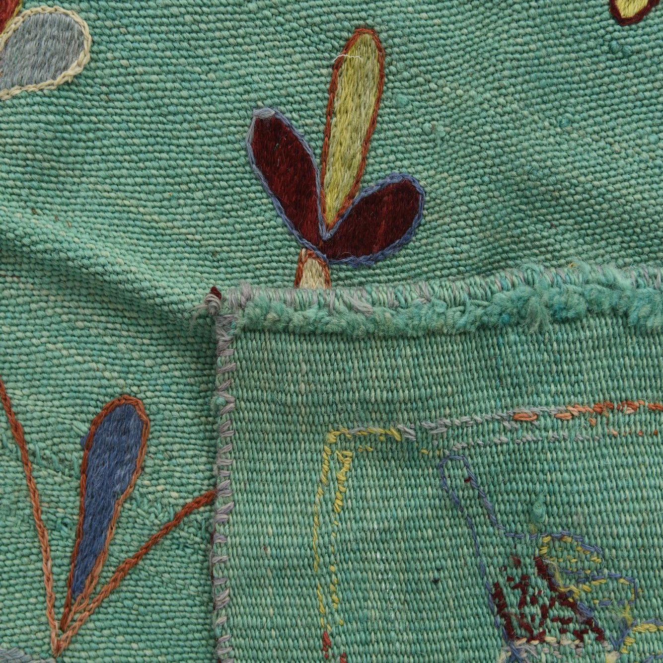 A 5'10" x 6'10" square green Kilim Suzani rug with colorful tribal and floral embroidery.
