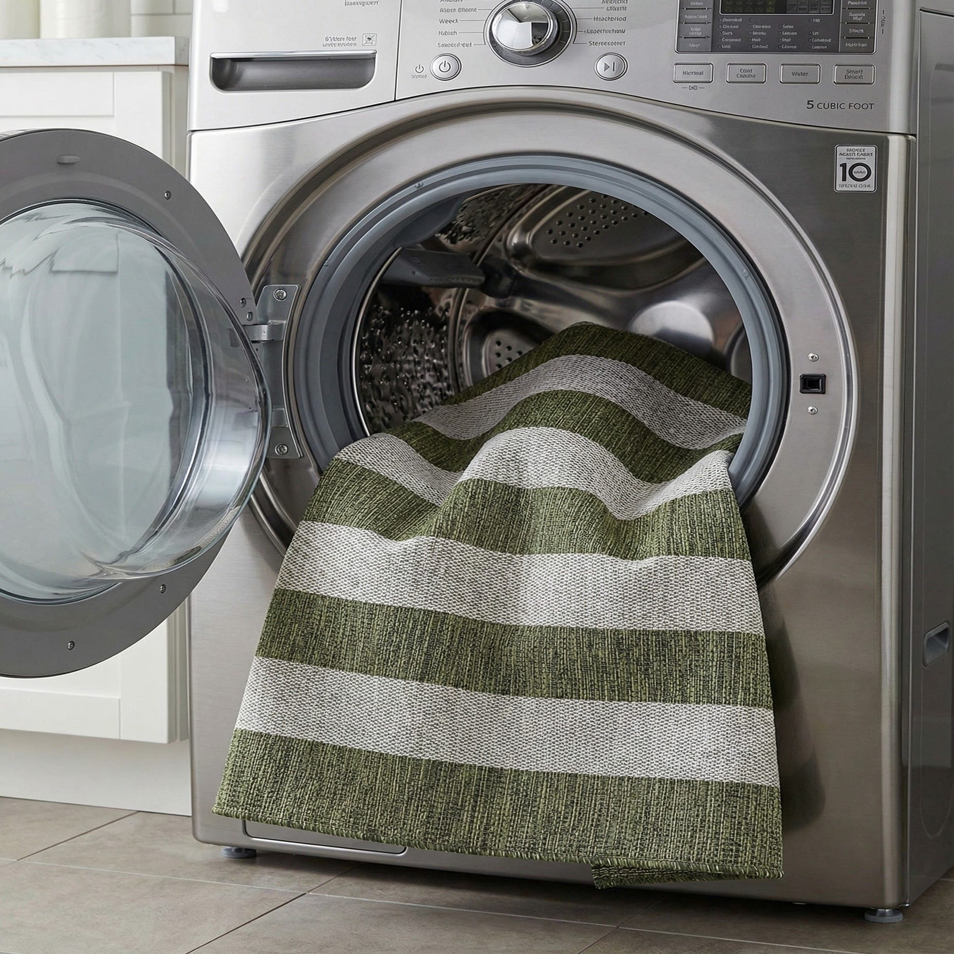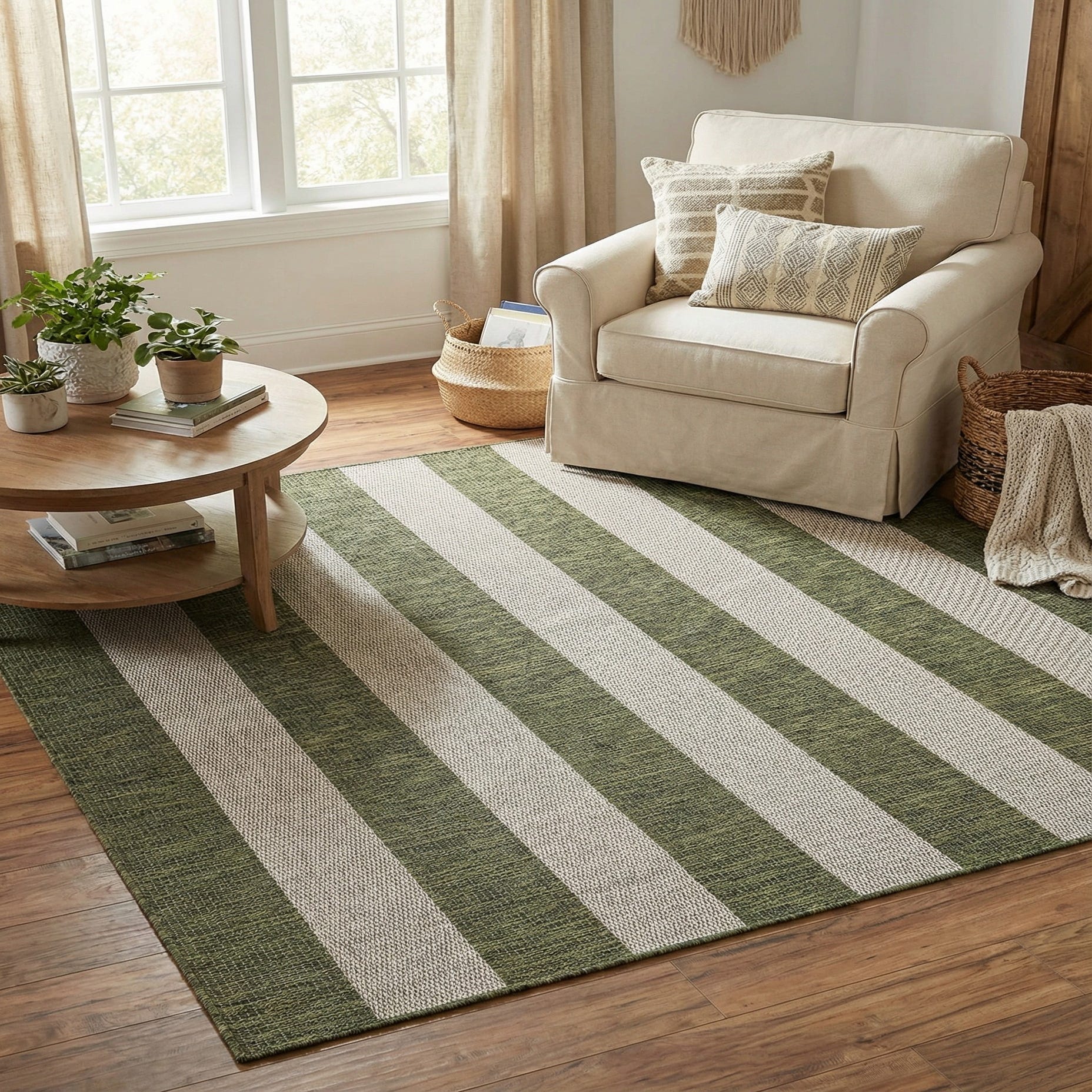 A 6x6 square green and white striped flatweave rug, ideal for a patio or indoor space.
