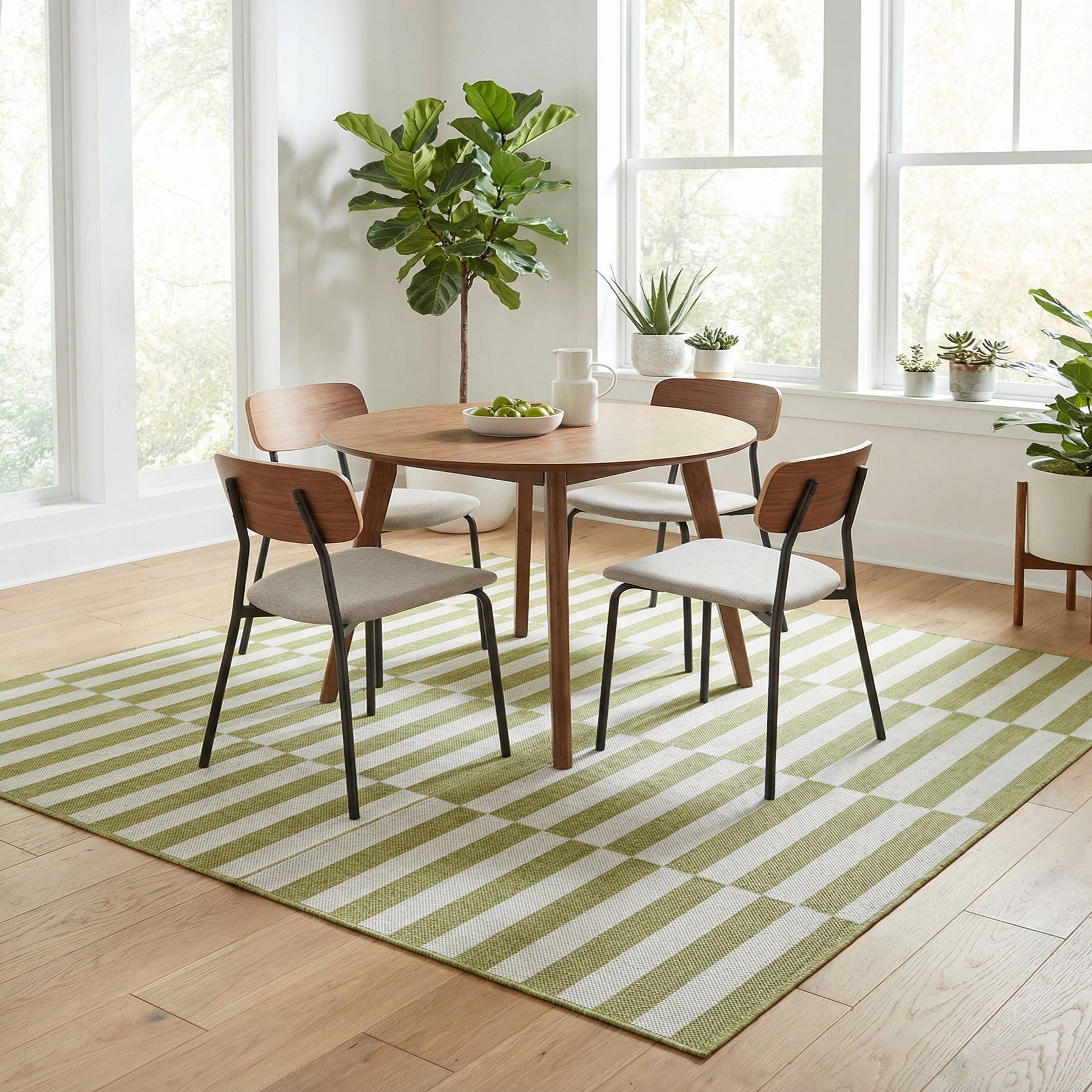 The Outdoor Ribbon Collection offers a 6 Ft Square rug that employs a harmonious blend of green and ivory stripes to create a refreshing and inviting ambience for any outdoor space. The rug's pattern, featuring a smart juxtaposition of broad and narrow bands, draws inspiration from classic ribbon designs while offering a contemporary twist suitable for modern decors.