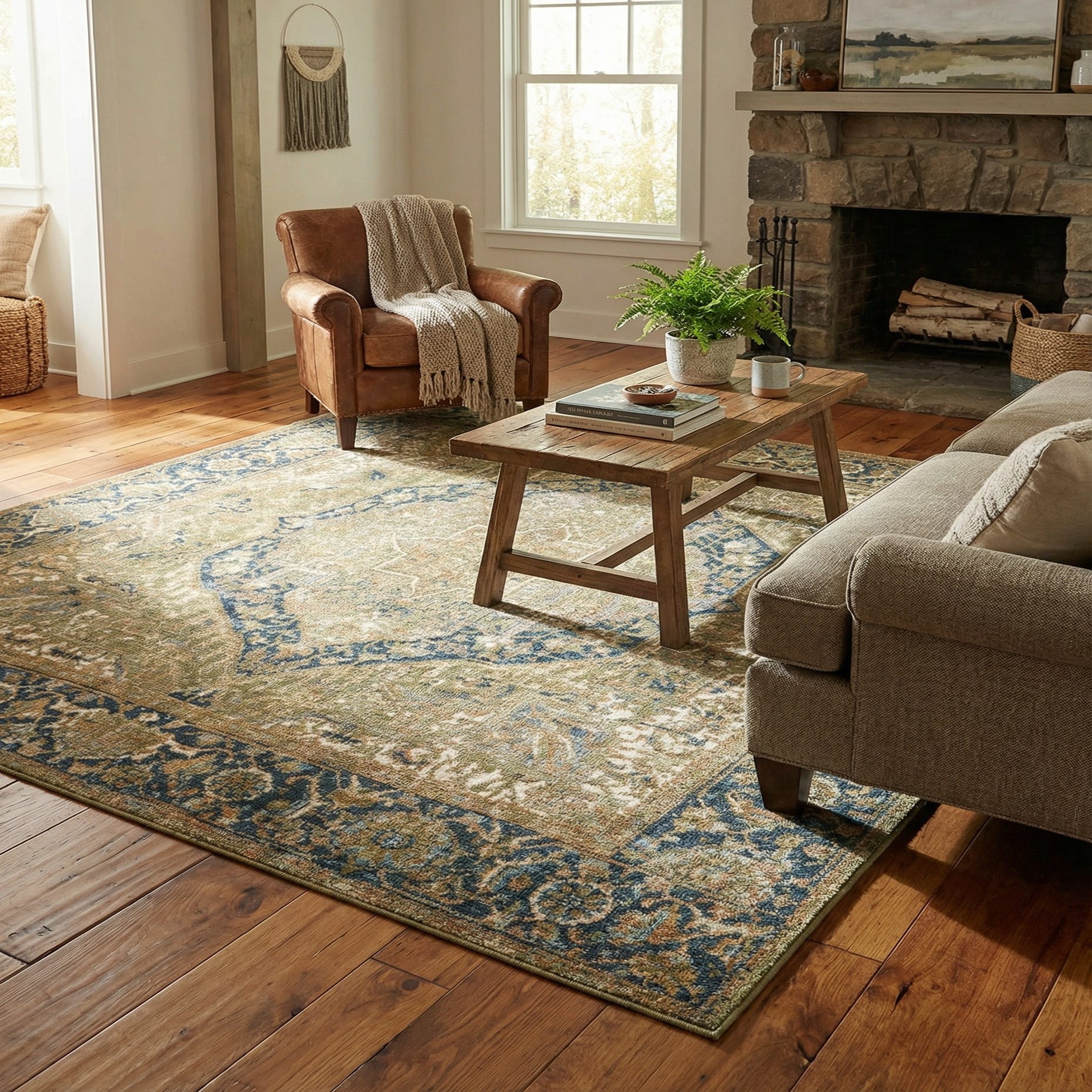 Primary color is Green. Colors in this rug include: Green, Beige, Light Blue, Light Brown, Olive, Terracotta.