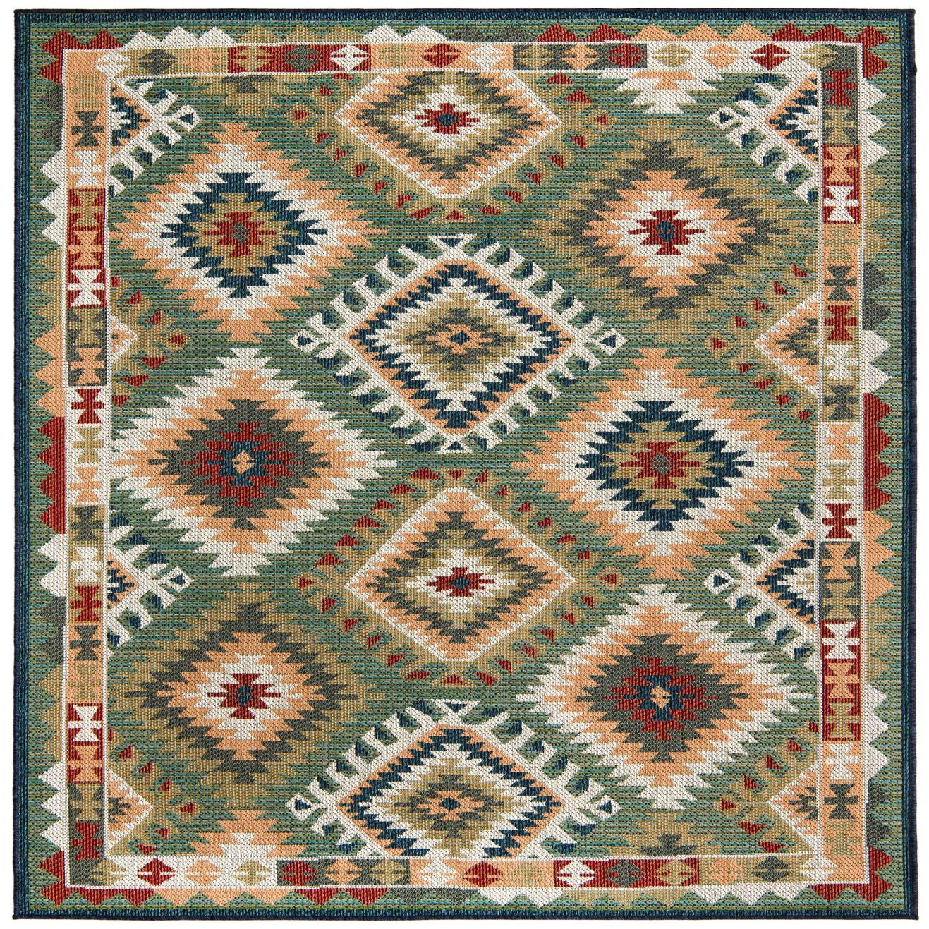 A 6x9 rectangular Baja Outdoor rug featuring a Southwestern geometric pattern in shades of green, peach, red, and navy.