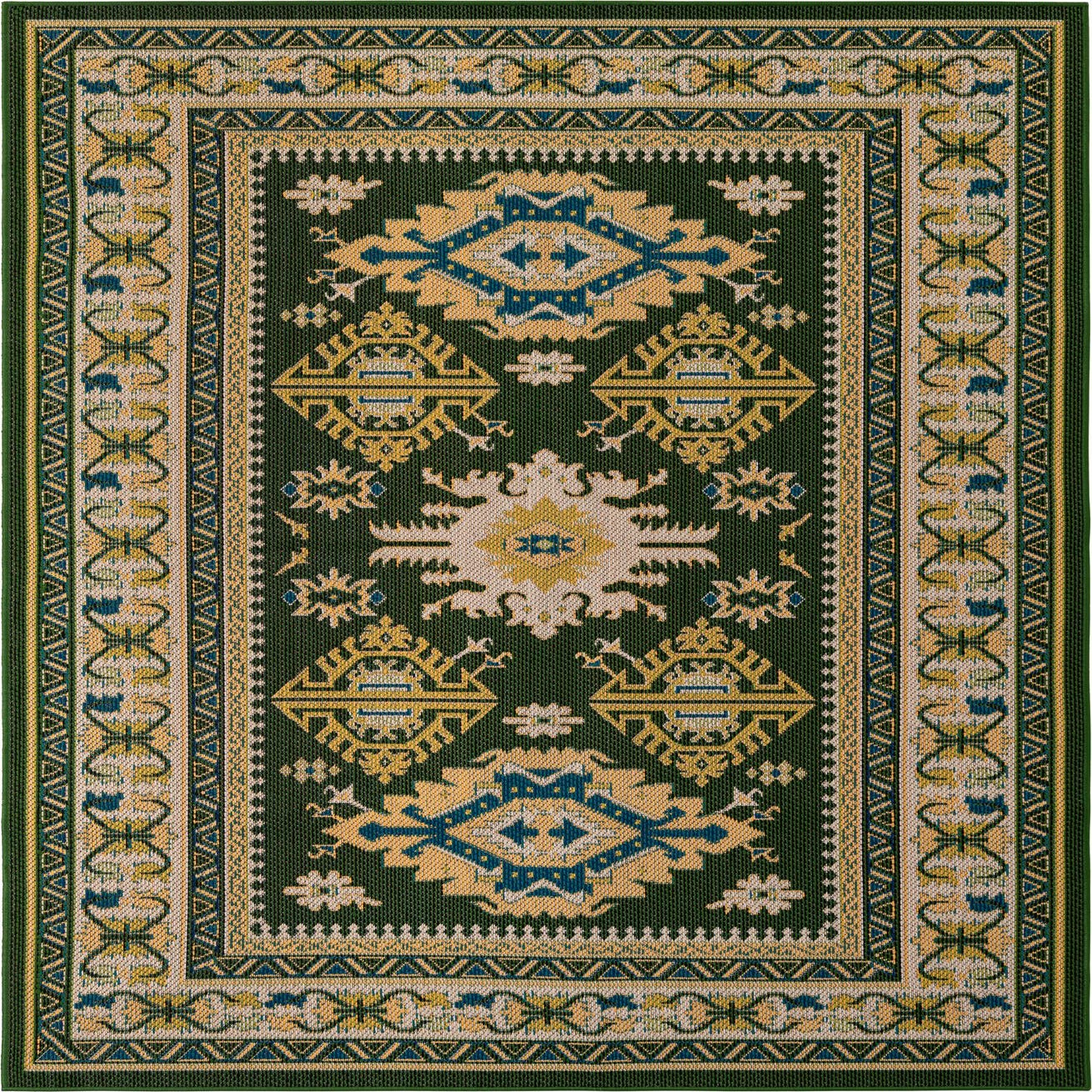 A classic medallion-and-border motif rendered in lively color and tight, outdoor-ready construction. The deep green background anchors a sequence of geometric medallions and stylized floral elements in blue, yellow, pink and ivory, with a narrow ivory inner border and a patterned outer guard that frames the field. Machine-made from 100% polypropylene, the rug has a low, tightly woven pile that feels firm underfoot and maintains defined pattern detail — the surface is smooth to the touch with the slight texture typical of durable outdoor weave.