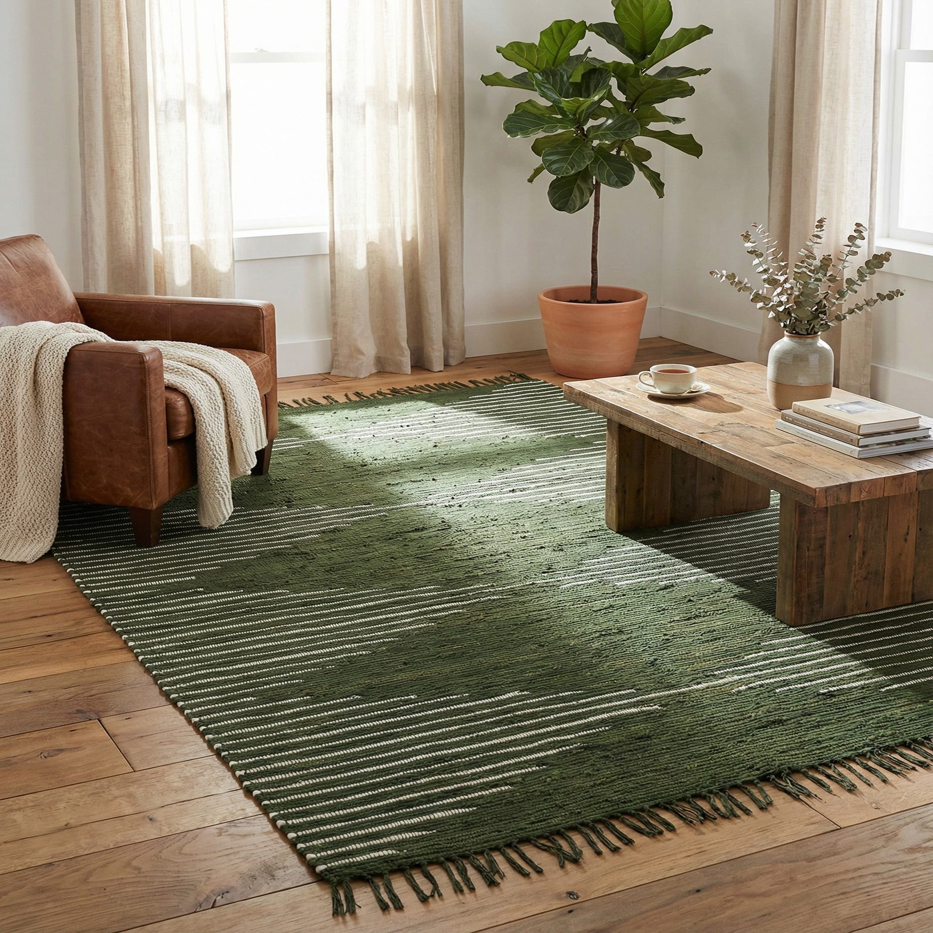 Use it to anchor a casual living room seating group, tuck it beneath a dining table to introduce pattern without adding bulk, or layer it in a bedroom for added texture and color. It pairs naturally with warm wood tones, rattan or leather furnishings, and light neutral textiles, making it a good match for modern, bohemian, or farmhouse-inspired interiors.