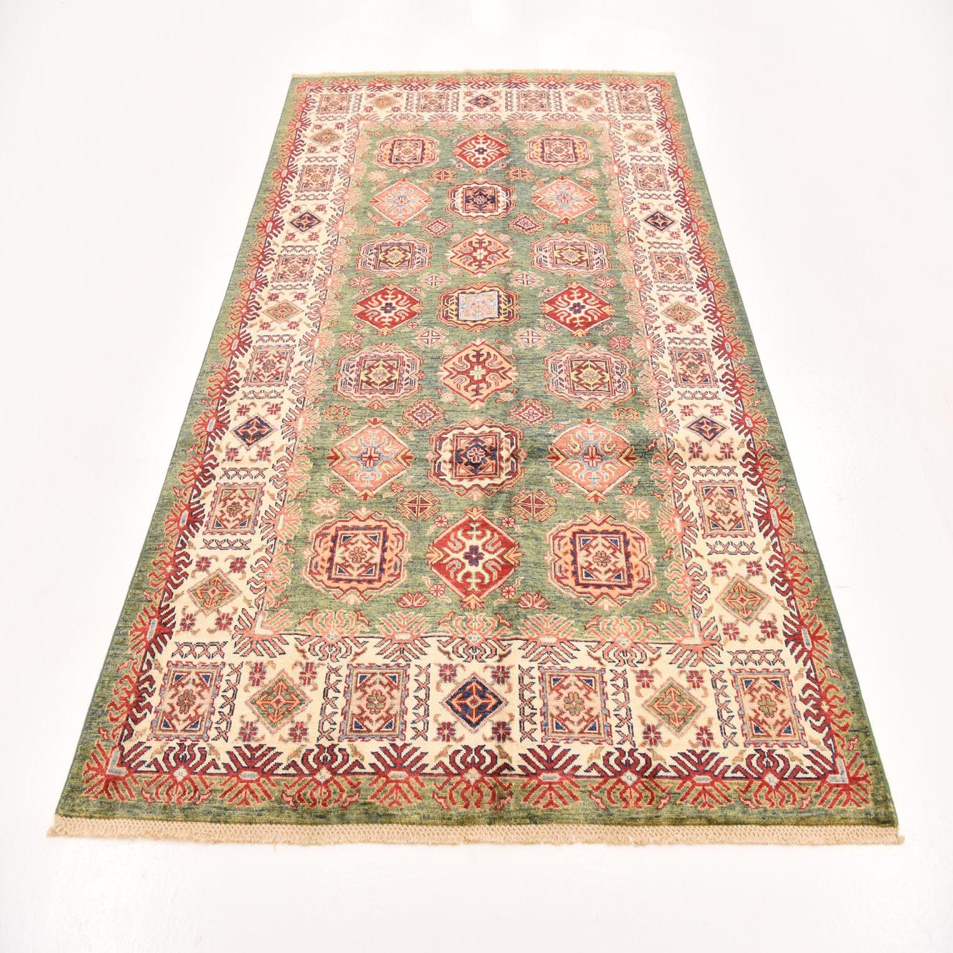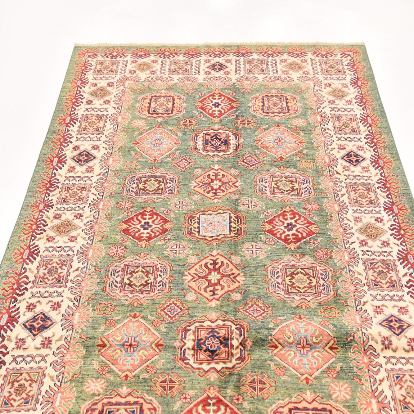 A 6x9 rectangular Rugs.com Kazak rug with a traditional Southwestern pattern in greens, reds, and creams.