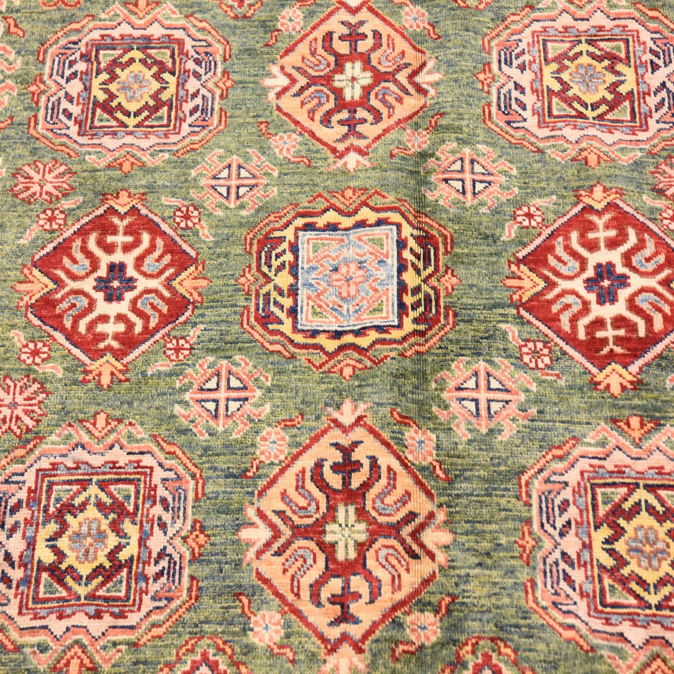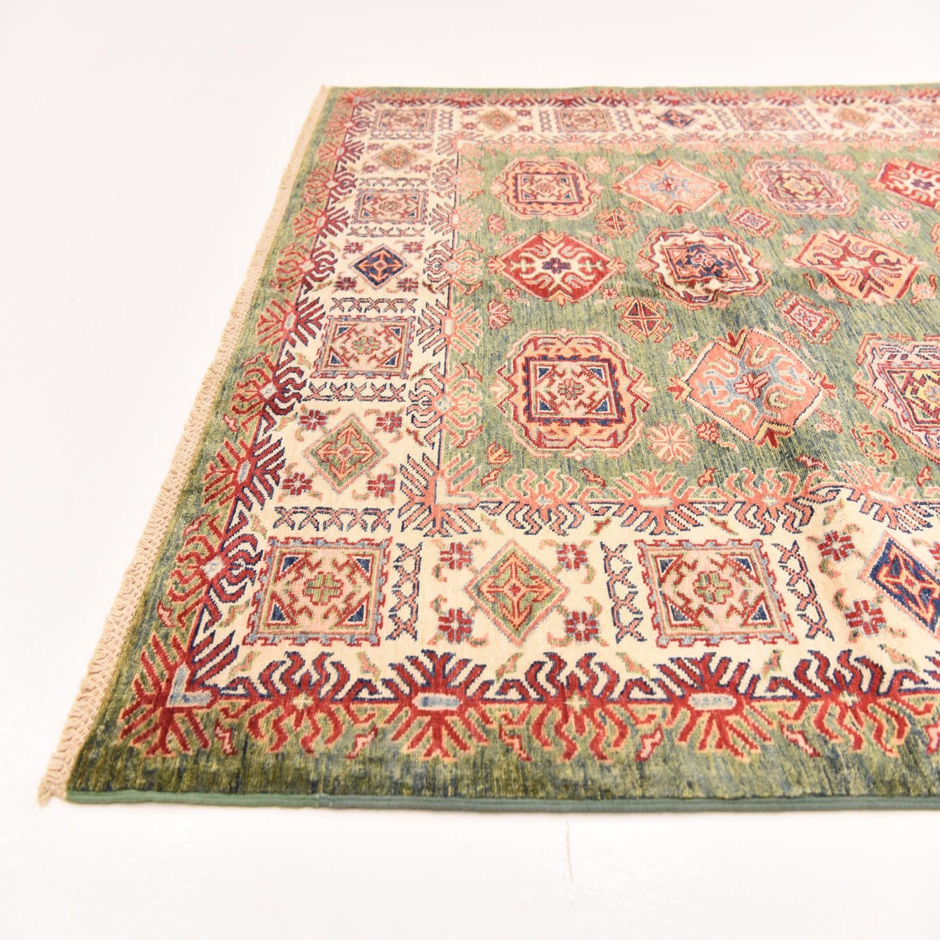 This Kazak collection rug is hand-knotted from 100% hand-spun wool, offering both durability and a pleasant tactile experience. Sized at 6x9, the rug showcases an intricate geometric pattern that is symmetrical and traditional in nature, with motifs suggestive of tribal influences. The rich background color of green sets a bold foundation for the design, complemented by an array of accent hues including black, blue, brown, cream, red, navy blue, salmon, and peach, providing a versatile palette for an array of decorative schemes.