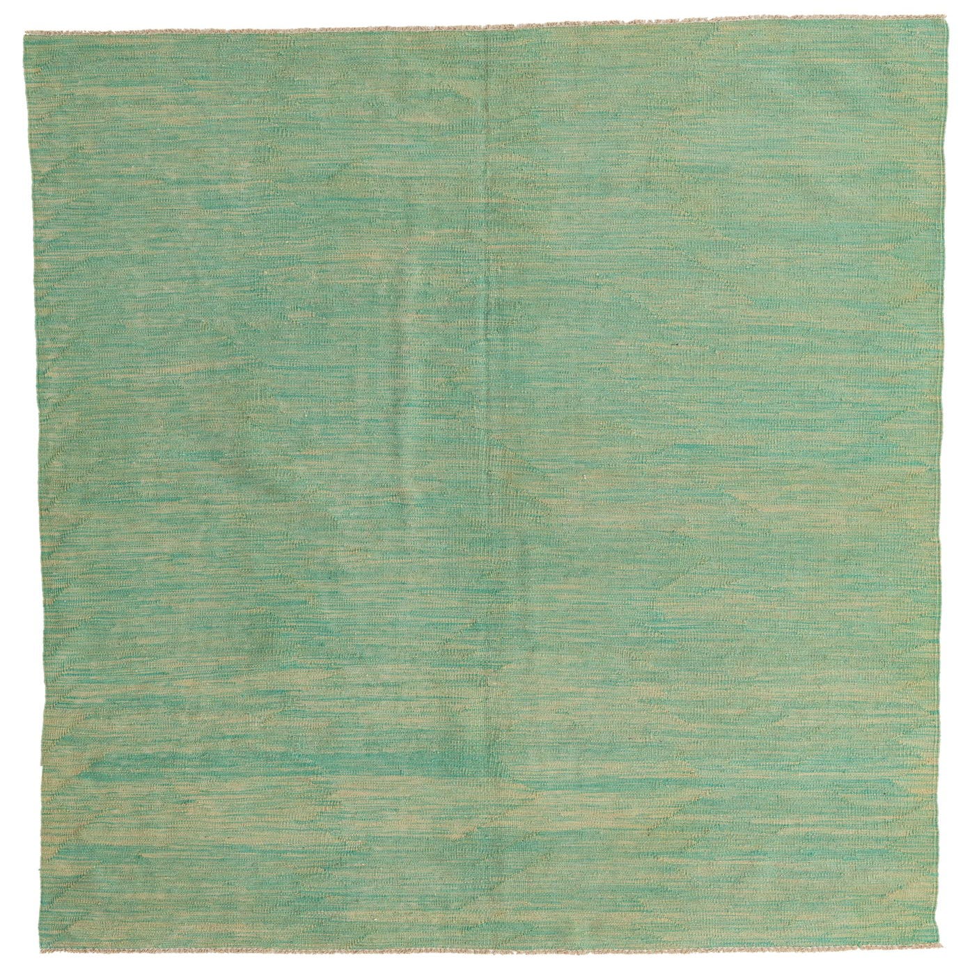 This Kilim Modern rug, measuring 6x9 feet, is a hand-woven creation crafted from 100% wool. It presents a simplistic yet compelling pattern, predominantly in a soothing green, accented subtly with beige lines that provide a gentle contrast. The texture is indicative of the high-quality wool fiber, offering a tactile experience underfoot.