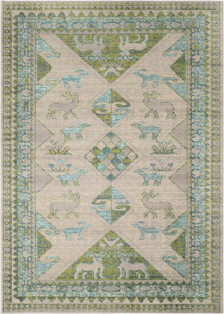 Primary color is Green. Colors in this rug include: Green, Gray, Ivory, Teal.