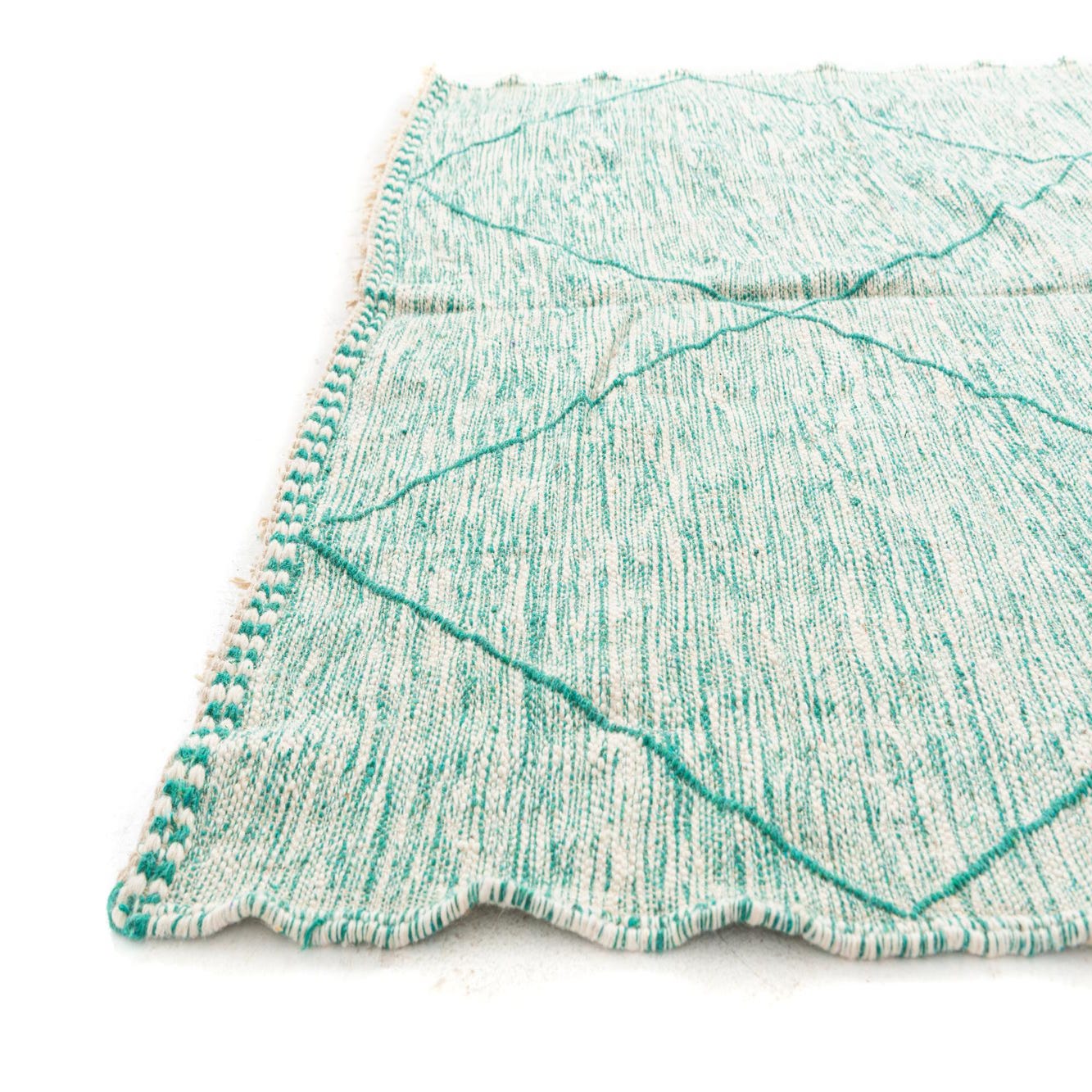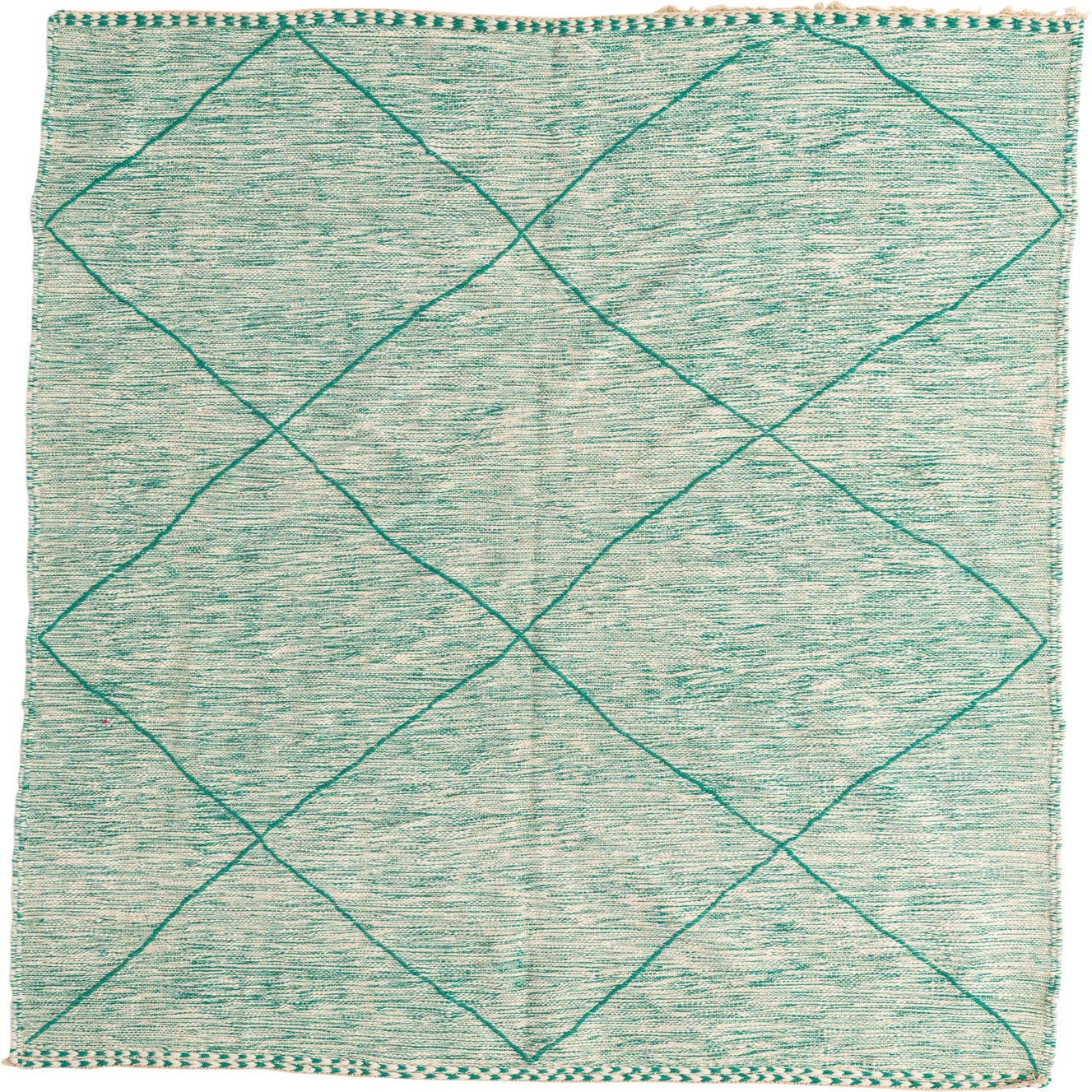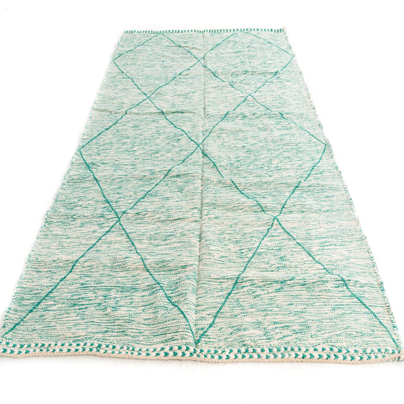 A 6x9 rectangular green and off-white Moroccan shag rug with a tribal diamond pattern, ideal for a living room.