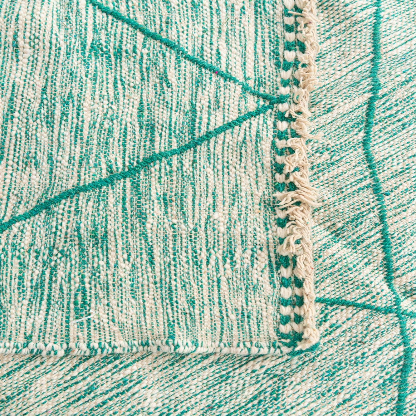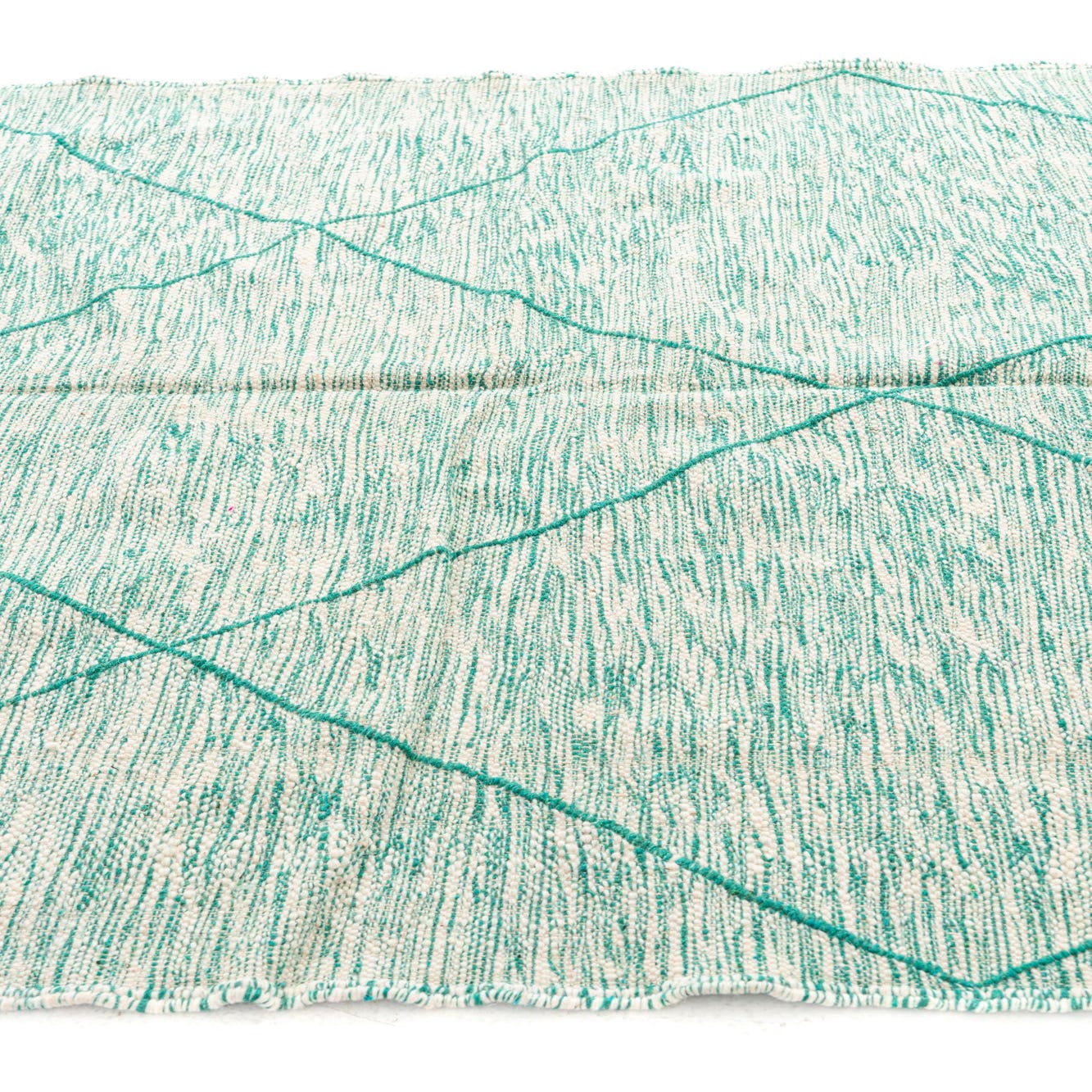 This rug pairs well with light wood furnishings and neutral upholstery for a calm, layered aesthetic, or with brass and rattan accents for a relaxed, modern-bohemian room. Use it to anchor a seating area, soften the floor at the foot of a bed, or add textural depth to a bright dining space. Its toned-down palette and simple geometric motif make it easy to integrate into contemporary, coastal, or Scandinavian-inspired interiors.