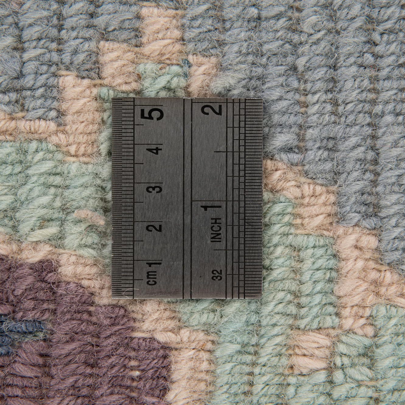 Primary color is Green. Colors in this rug include: Green, Ivory, Light Blue, Light Green, Navy Blue, Purple.