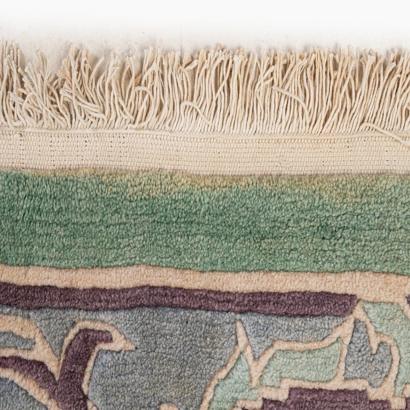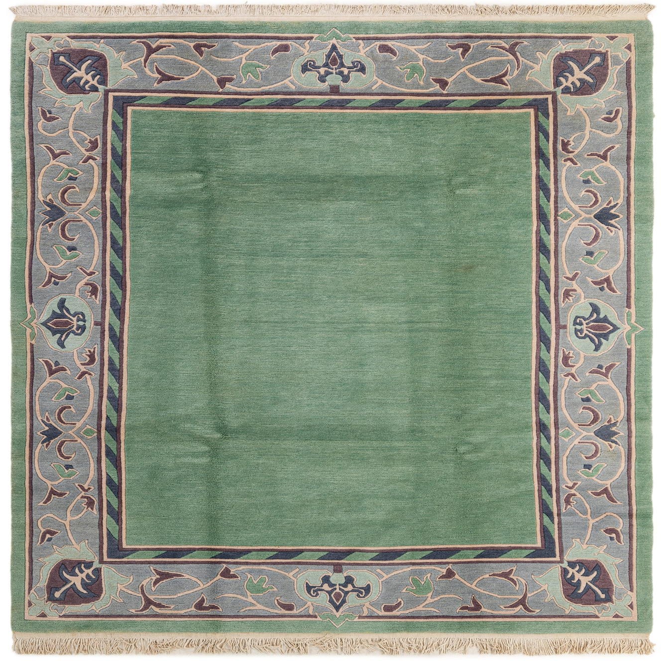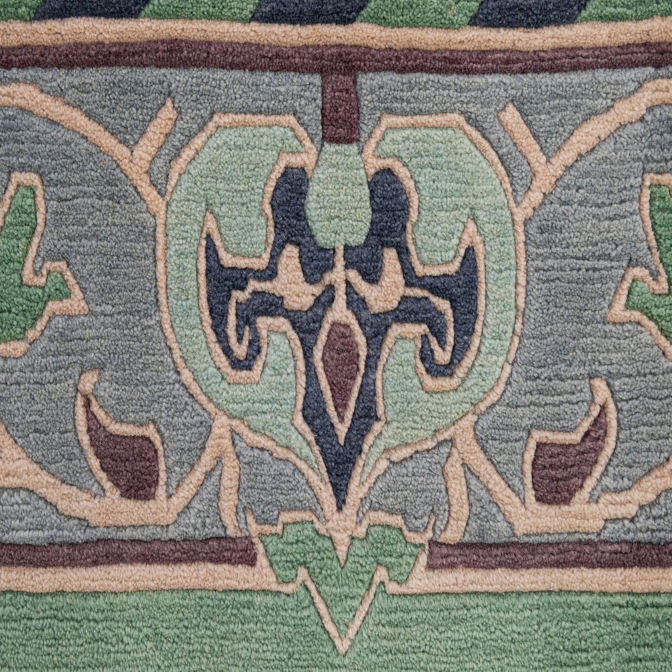 A 6x9 rectangular green wool rug with a detailed Oriental border in shades of blue, purple, and beige, featuring floral and vine motifs.