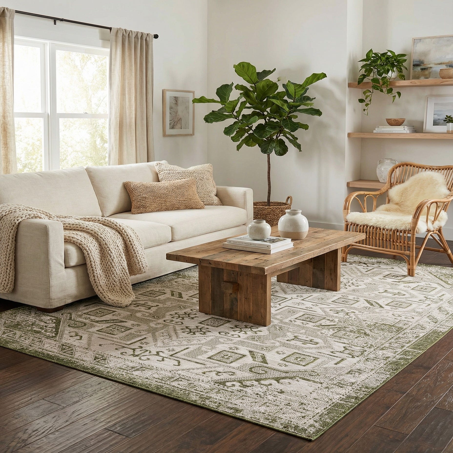 Primary color is Green. Colors in this rug include: Green, Ivory.