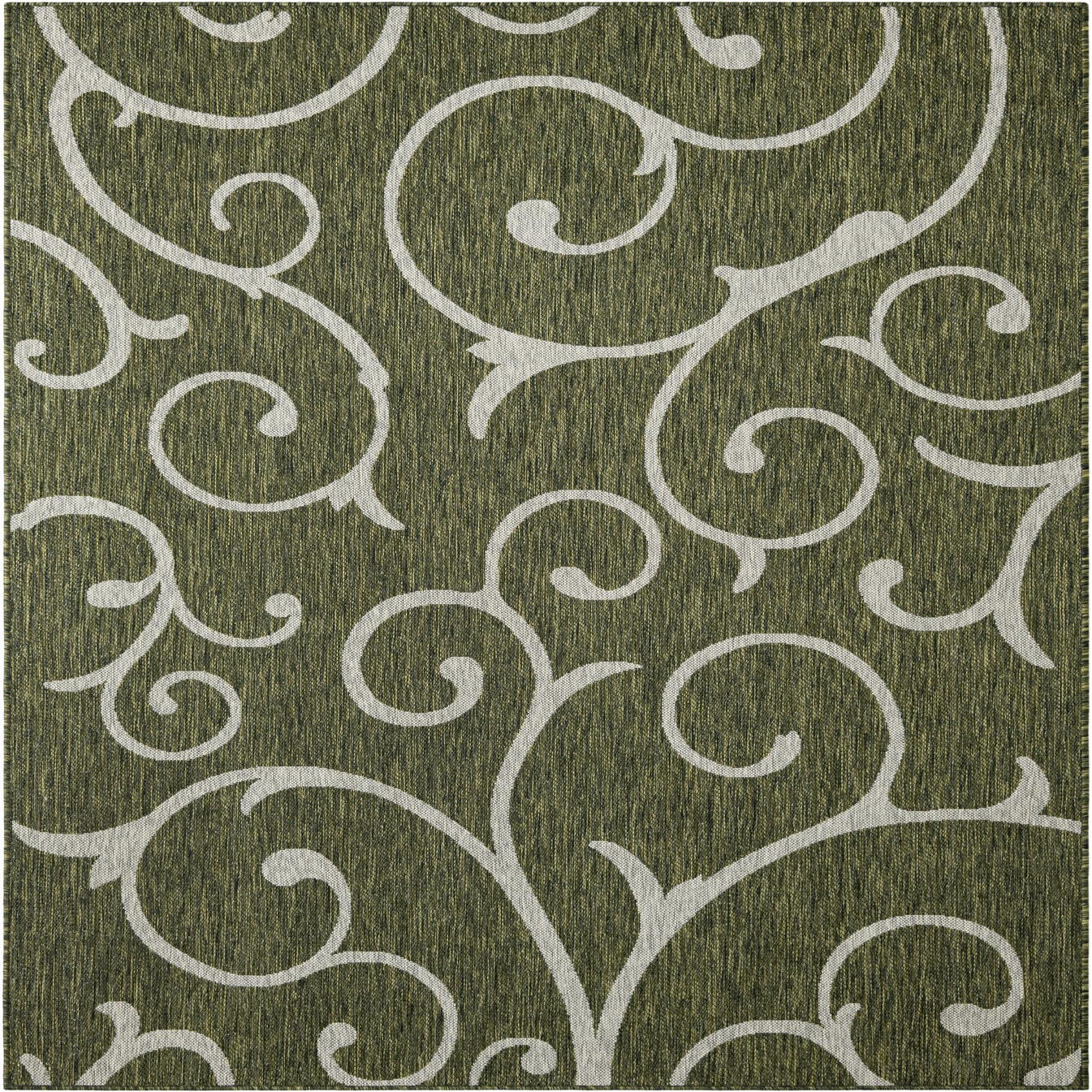 A 6x9 rectangular green indoor/outdoor rug with a white, flowing botanical scroll pattern, suitable for a patio or living room.