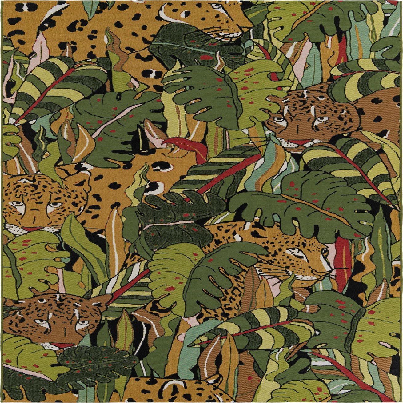 A 6x9 rectangular rug featuring a vibrant green and brown jungle pattern with hidden leopards, suitable for indoor or outdoor use.