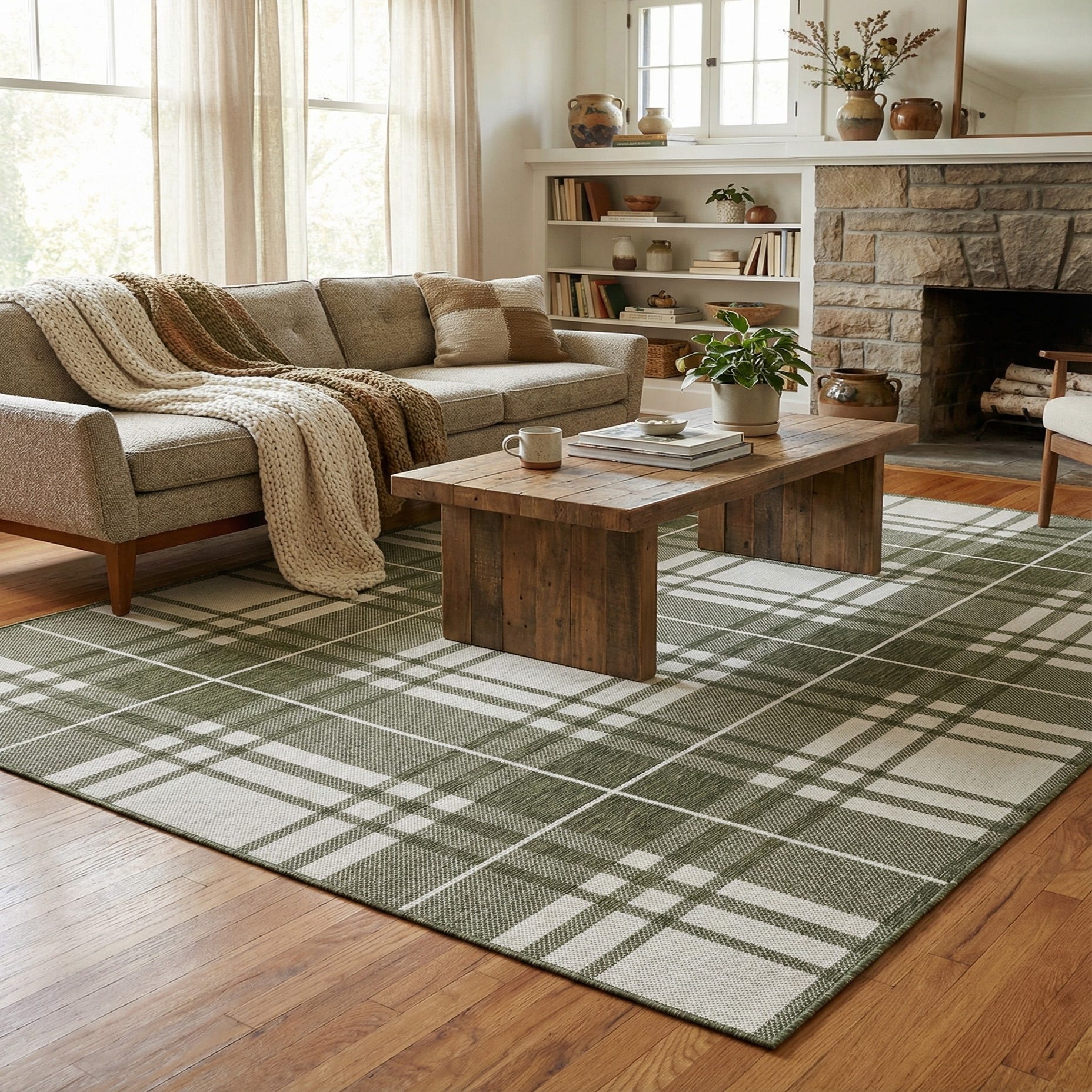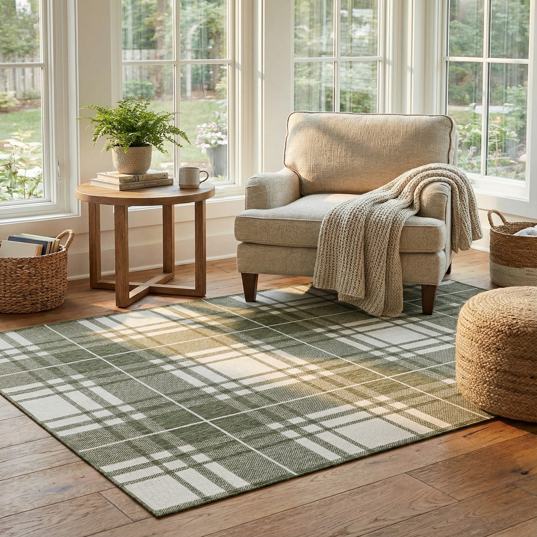 A classic checkered pattern in a fresh green background with crisp ivory grid lines gives this rug a tailored, familiar look. The design layers narrow and wide stripes to form a modern plaid, and the machine-made construction in 100% polypropylene produces a low-profile, tightly woven surface with a slightly textured, basket?weave feel underfoot. The ivory accents pop against the green field, creating a clean, structured pattern that pairs easily with both solid and patterned furnishings.