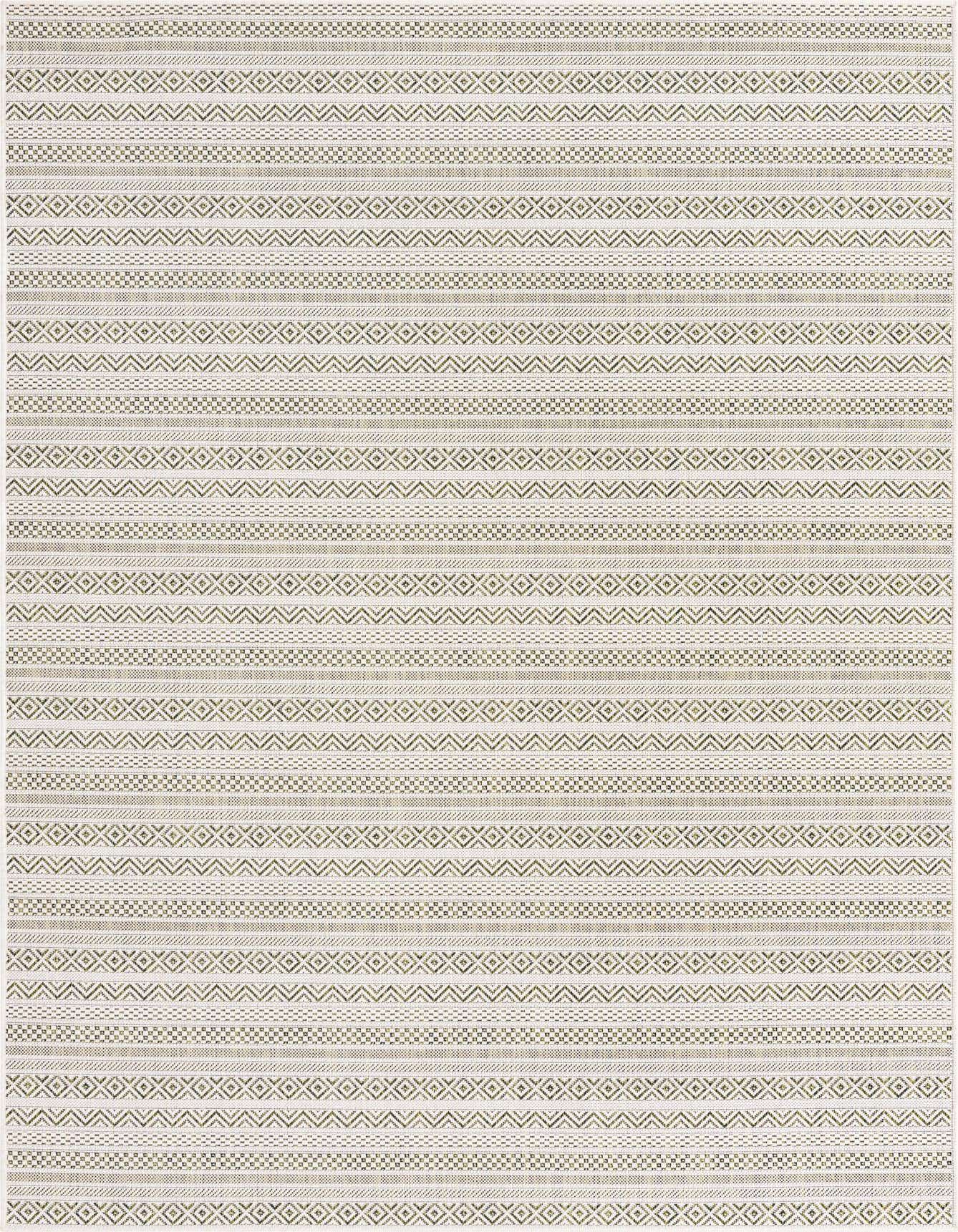 The Outdoor Ribbon collection presents a 6x9 area rug that exhibits a harmonious interplay of green and ivory tones. The prominent green background provides a refreshing canvas for the geometric ribbon pattern in ivory, delivering a contemporary aesthetic with a nod to tribal designs. Machine-woven from 100% polypropylene, this rug features a flatweave construction that ensures durability and a surface that is both pet-friendly and stain-resistant, catering to a carefree outdoor lifestyle.