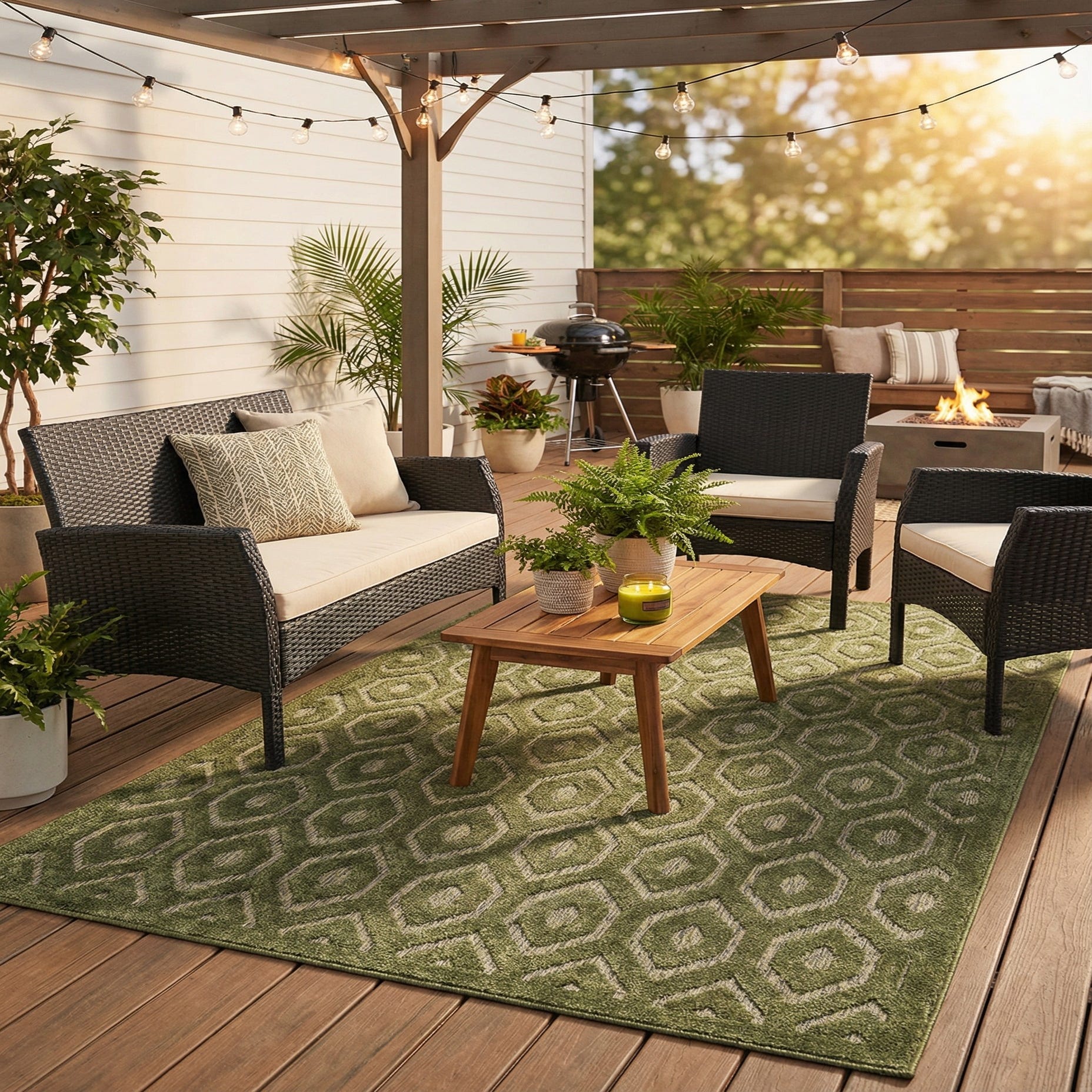 A 6x9 rectangular green indoor/outdoor rug with a textured high/low pile modern geometric trellis pattern.