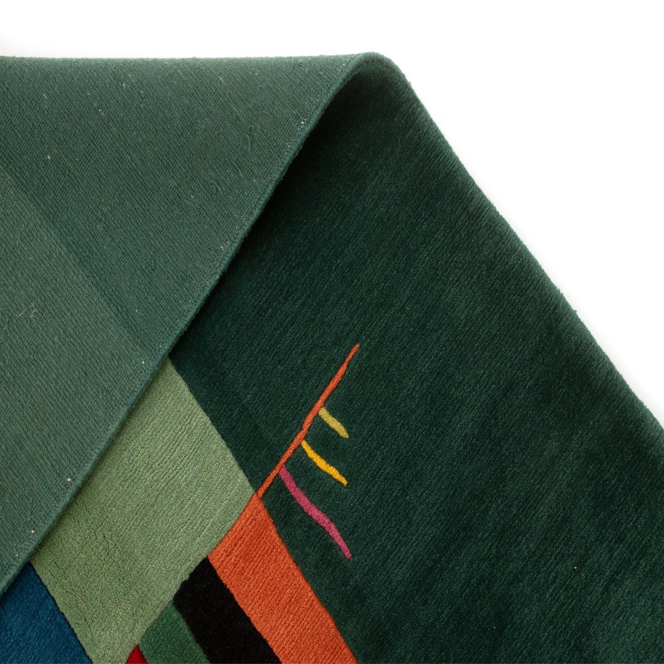 A 6x9 rectangular green Oriental rug with a vibrant, multicolored geometric pattern in the center, featuring squares and lines.
