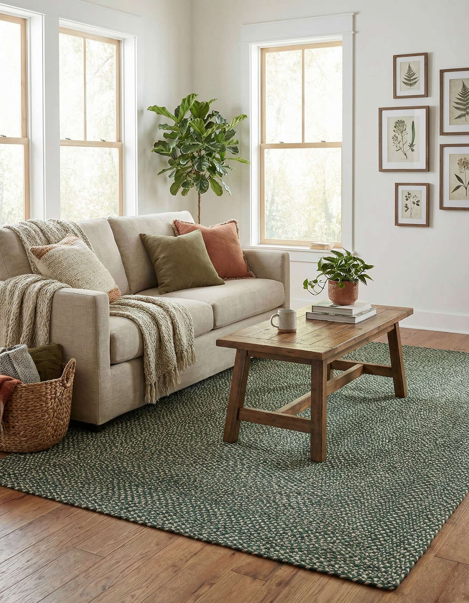 Pair this rug with natural wood furniture and linen upholstery for a relaxed, layered setting, or use it to add organic texture to a modern farmhouse or coastal-inspired room. It works well in living rooms and dining areas, beneath a coffee table or layered under a dining set, and also makes a sturdy entryway or sunroom anchor when you want warmth without heavy pile. Neutral accents, woven baskets and leafy plants complement the green-and-ivory palette and reinforce the rug’s casual, versatile character.