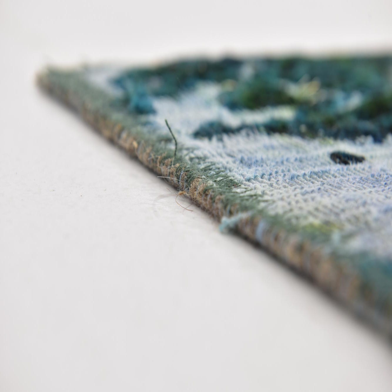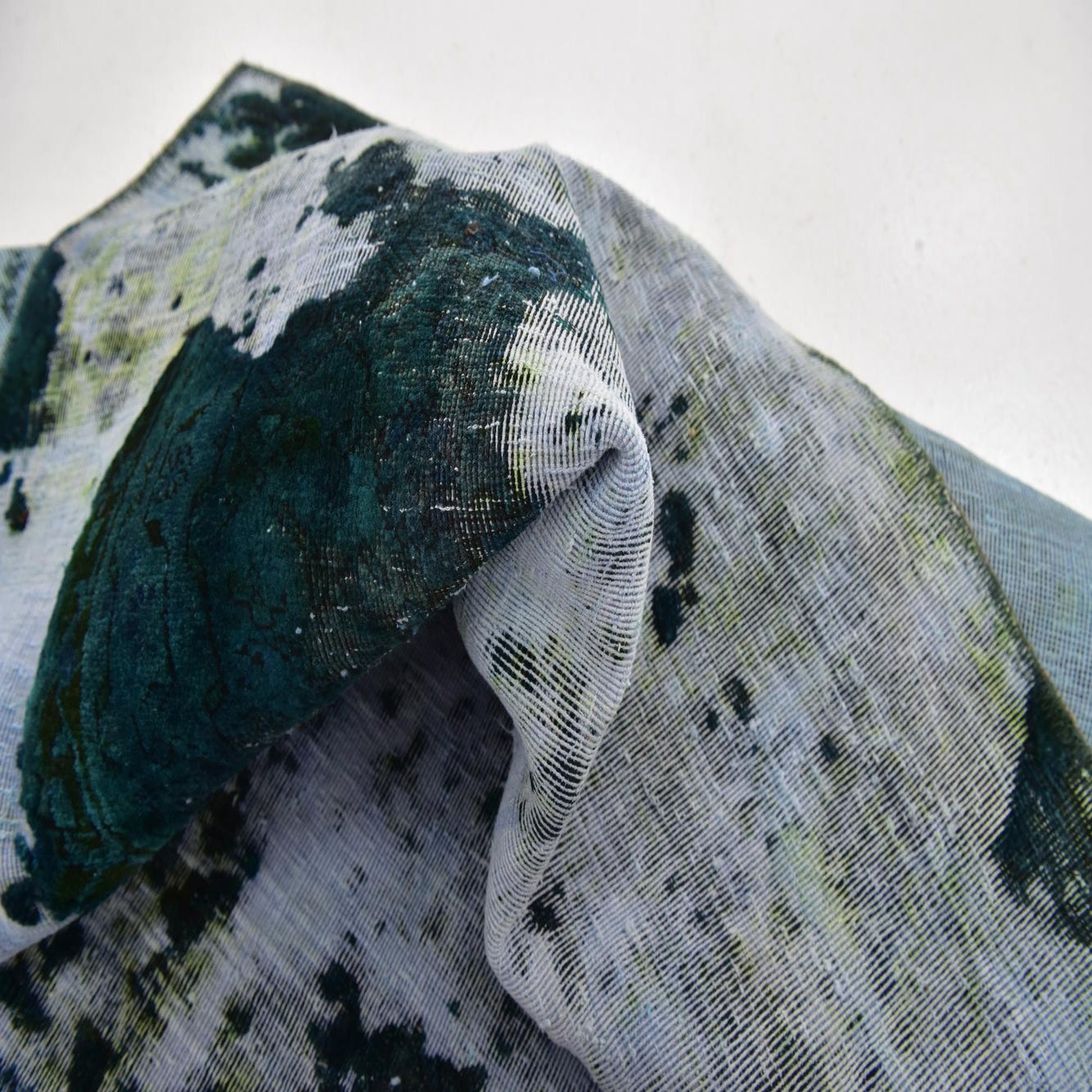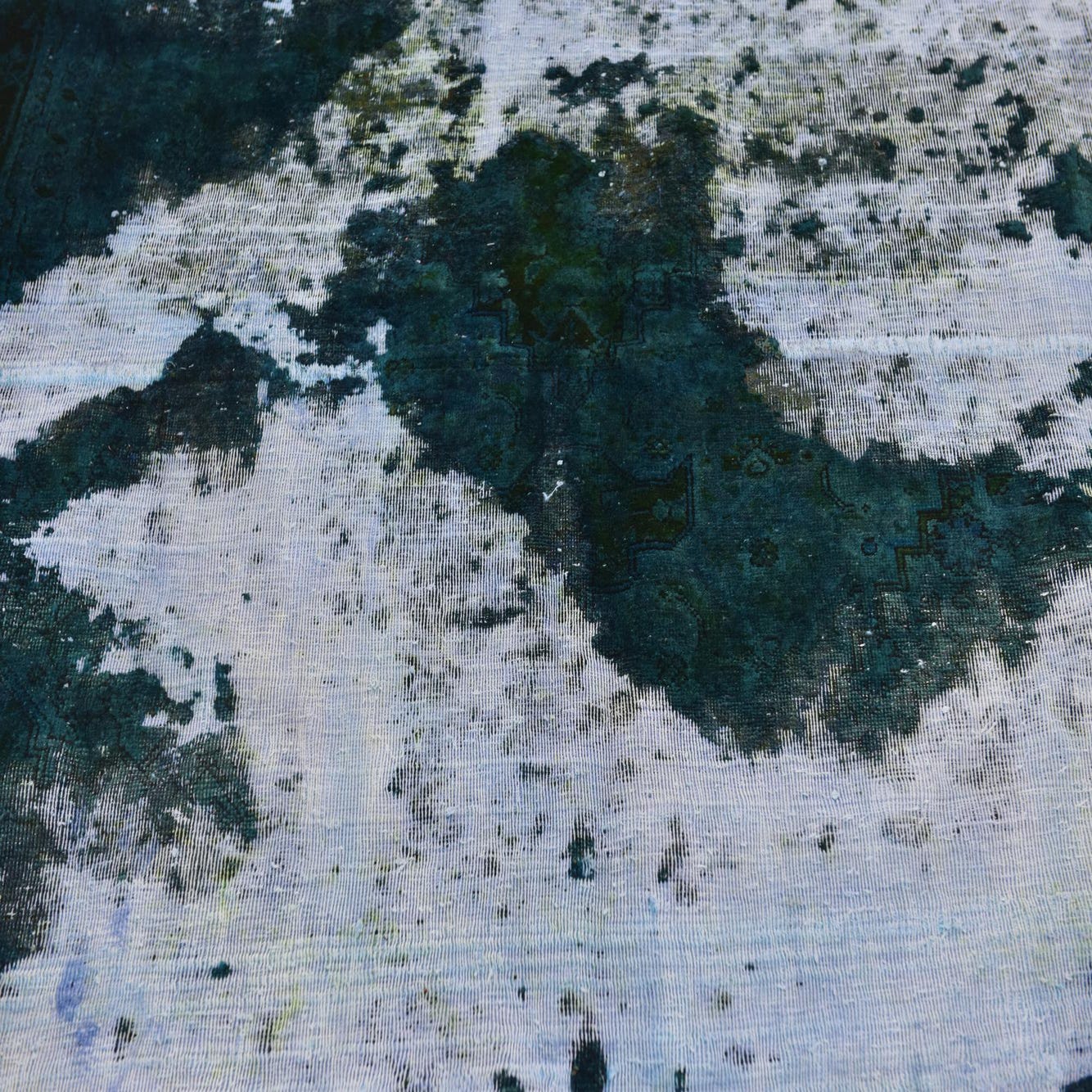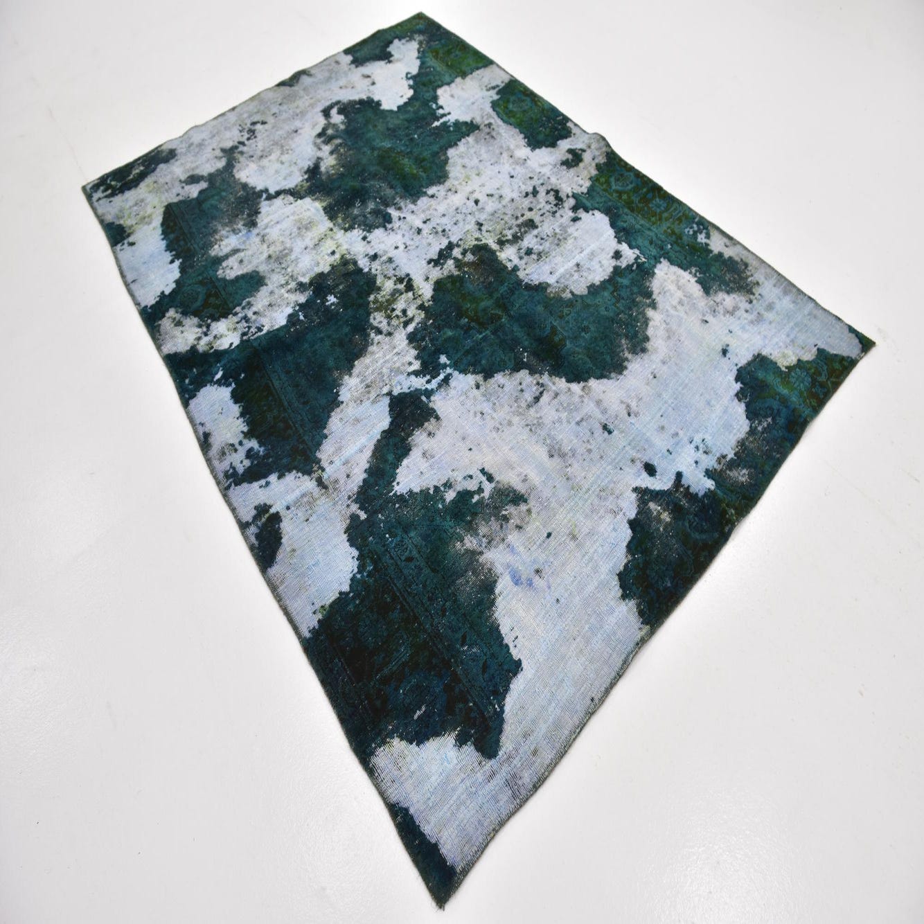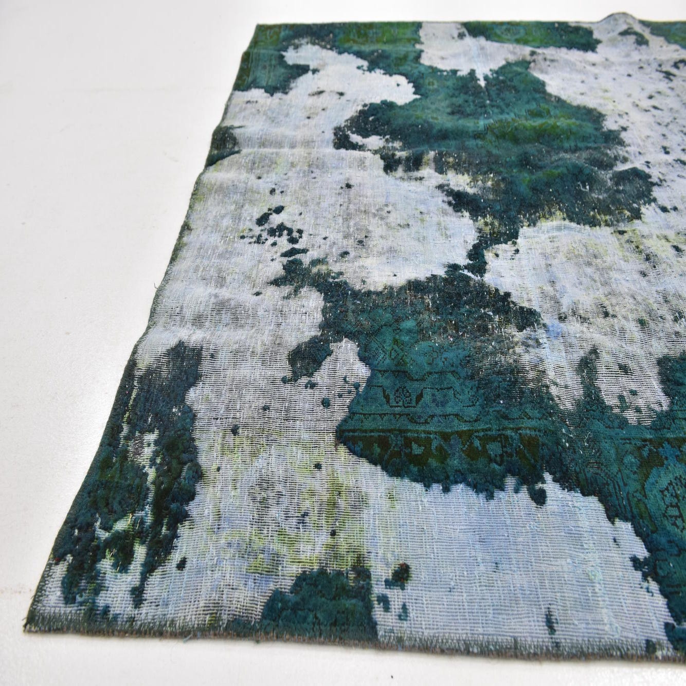 A 6x9 rectangular green and white abstract rug with a distressed, vintage-inspired pattern, suitable for a living room.