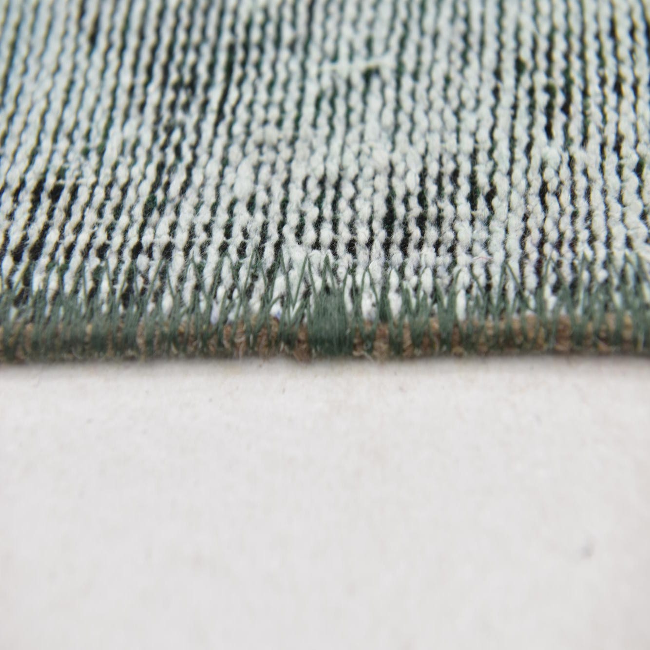 This hand-knotted Ultra Vintage rug showcases a richly textured, distressed pattern, imbuing the piece with an appealing time-worn aesthetic. The 6x9 rug features a green background with a layered design in cream, light green, and navy blue, creating a sophisticated but subtle color palette that is versatile and pleasing to the eye.
