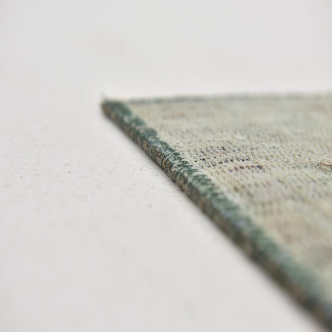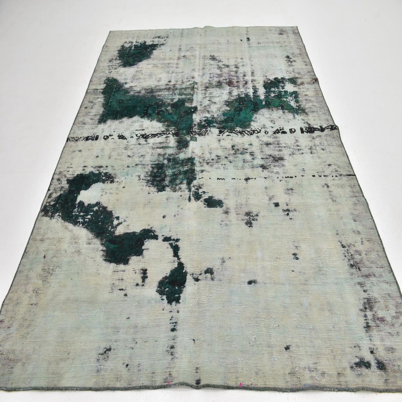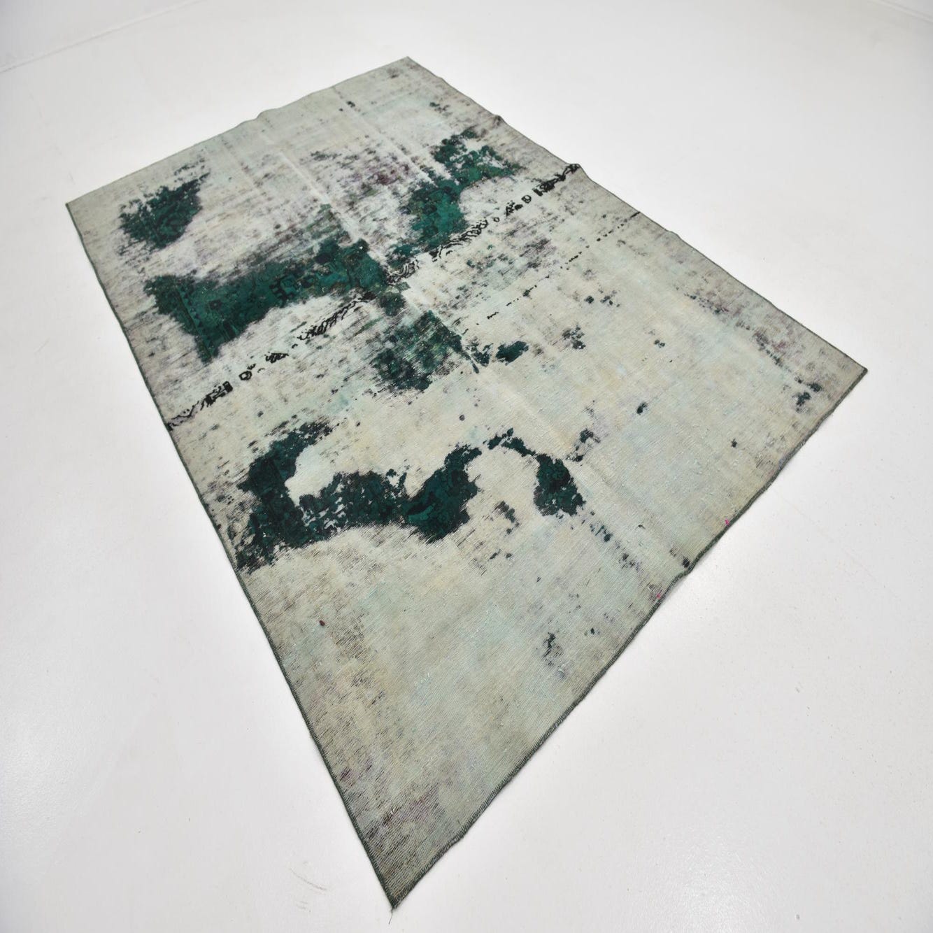 A 6x9 rectangular green and off-white distressed wool rug with an abstract vintage Persian pattern, ideal for a living room.