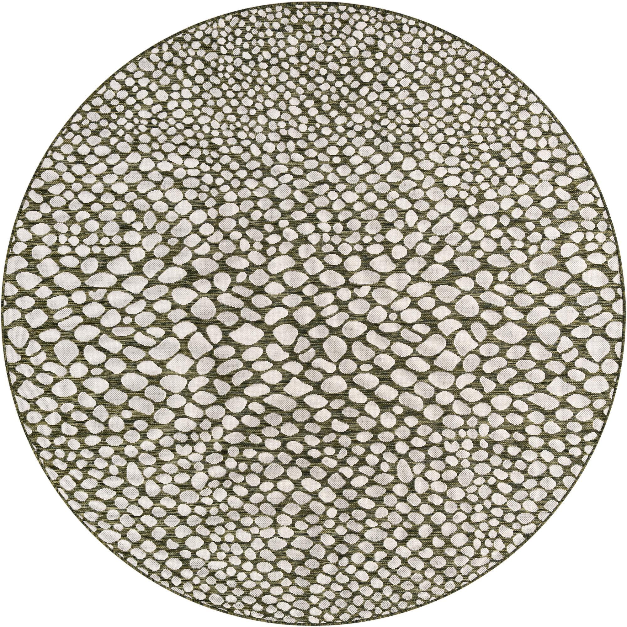 A 7' round green and white modern abstract rug with a pebble-like pattern, suitable for indoor or outdoor use.