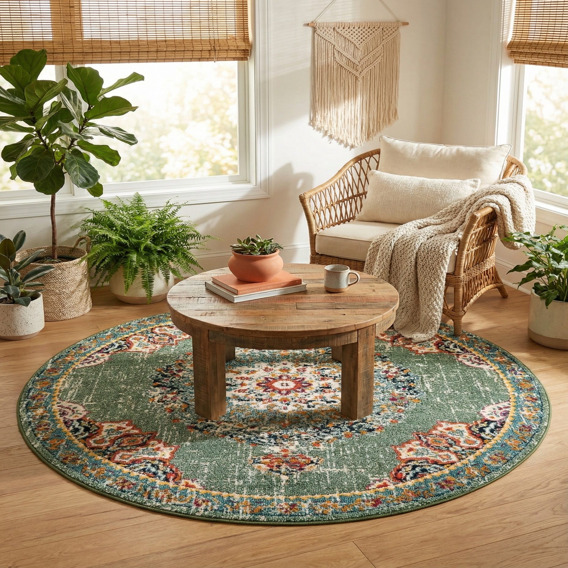 Warm and versatile, this rug works well beneath a round dining table, as the anchor for a cozy seating area, or tucked under a bedside bench to add color and pattern to the room. It pairs especially nicely with natural wood furniture and neutral upholstery, and complements transitional, bohemian, or global-inspired interiors where layered pattern and color bring the space to life.