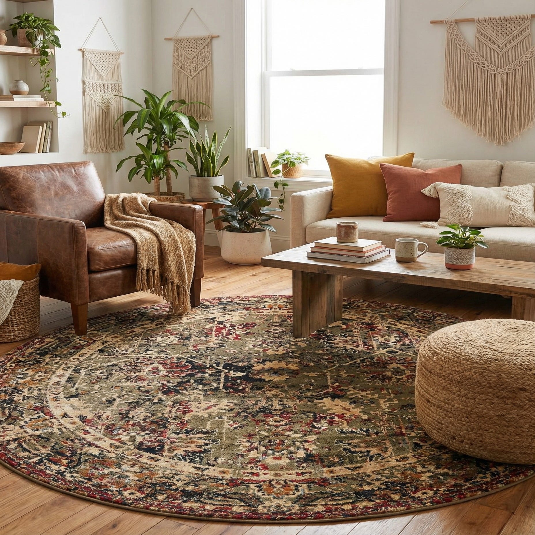 Machine made from 100% polypropylene, the rug has a low-profile, tightly woven surface that feels soft to the touch while holding its shape under furniture. Place it beneath a round dining table to define meals, center it in a cozy seating nook to ground sofas and chairs, or use it to warm a study or entry where patterned detail can complement wood tones and leather. It pairs well with transitional and traditional interiors as well as eclectic schemes that mix warm woods, neutral upholstery, and metal accents.