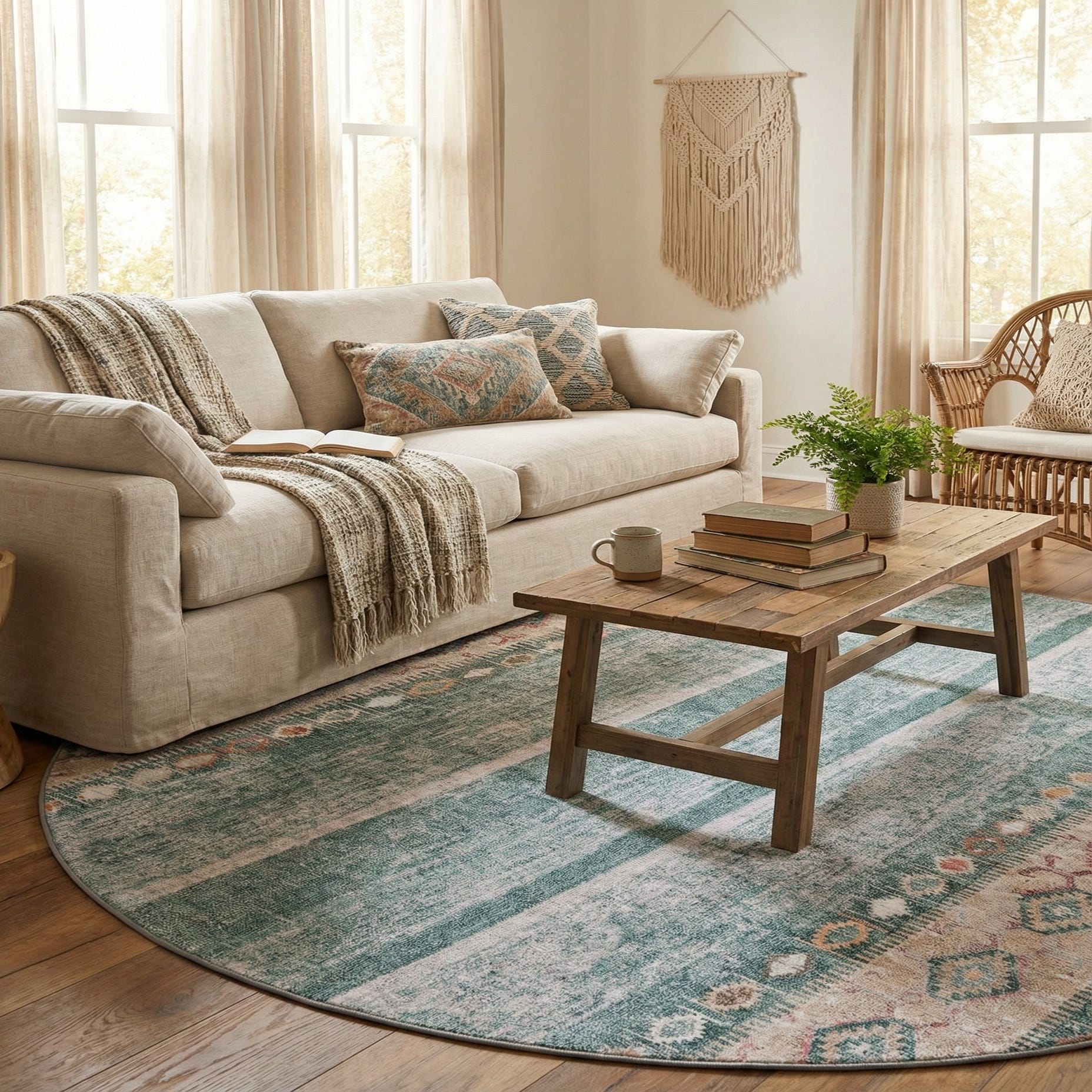 Place this round rug under a circular dining table or use it to define a cozy seating nook or reading corner. Its muted palette and casual, heritage pattern work well with transitional, farmhouse, coastal, or bohemian interiors, and it pairs easily with natural woods, woven textures, and neutral upholstery to create a layered, comfortable room.