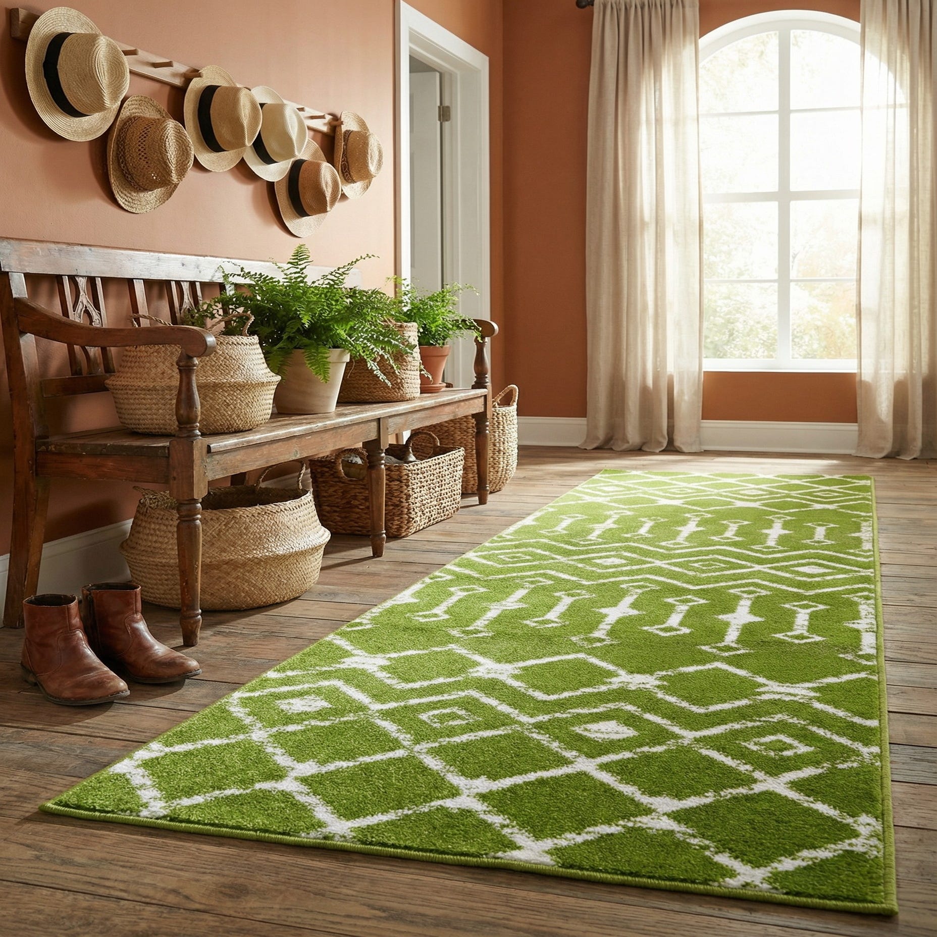 A lively green ground provides the backdrop for a repeating ivory trellis and geometric motif that alternates diamonds, chevrons and elongated medallions. The pattern has a hand-drawn quality, with slightly softened edges that give the design movement without feeling fussy. Machine-made from 100% polypropylene, the rug has a soft, slightly springy pile that feels pleasant underfoot and holds its shape across narrow paths and busy zones.