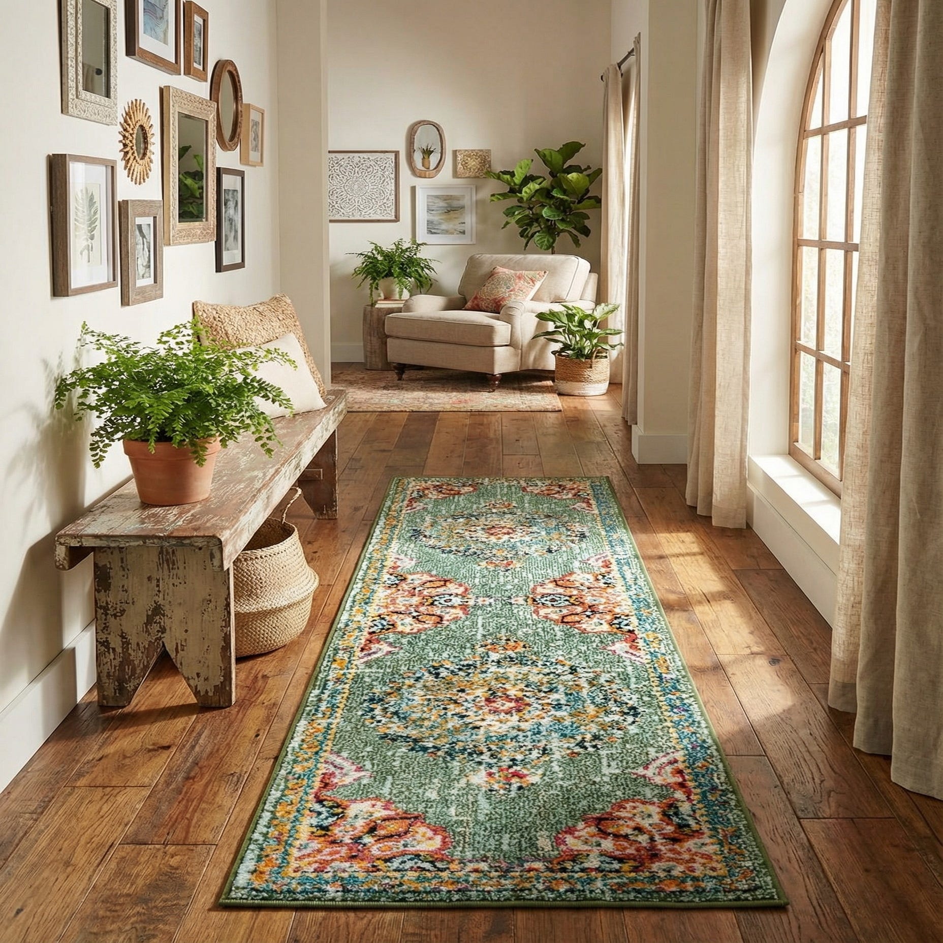 A classic medallion layout meets a relaxed, vintage-inspired finish in this runner. The green background provides a leafy, muted field for layered medallions and corner cartouches rendered in ivory, blue, olive, orange, red, yellow and pink. The pattern combines floral and geometric elements with a subtly distressed effect that lets the brighter accent tones pop against the green while maintaining an overall aged character.