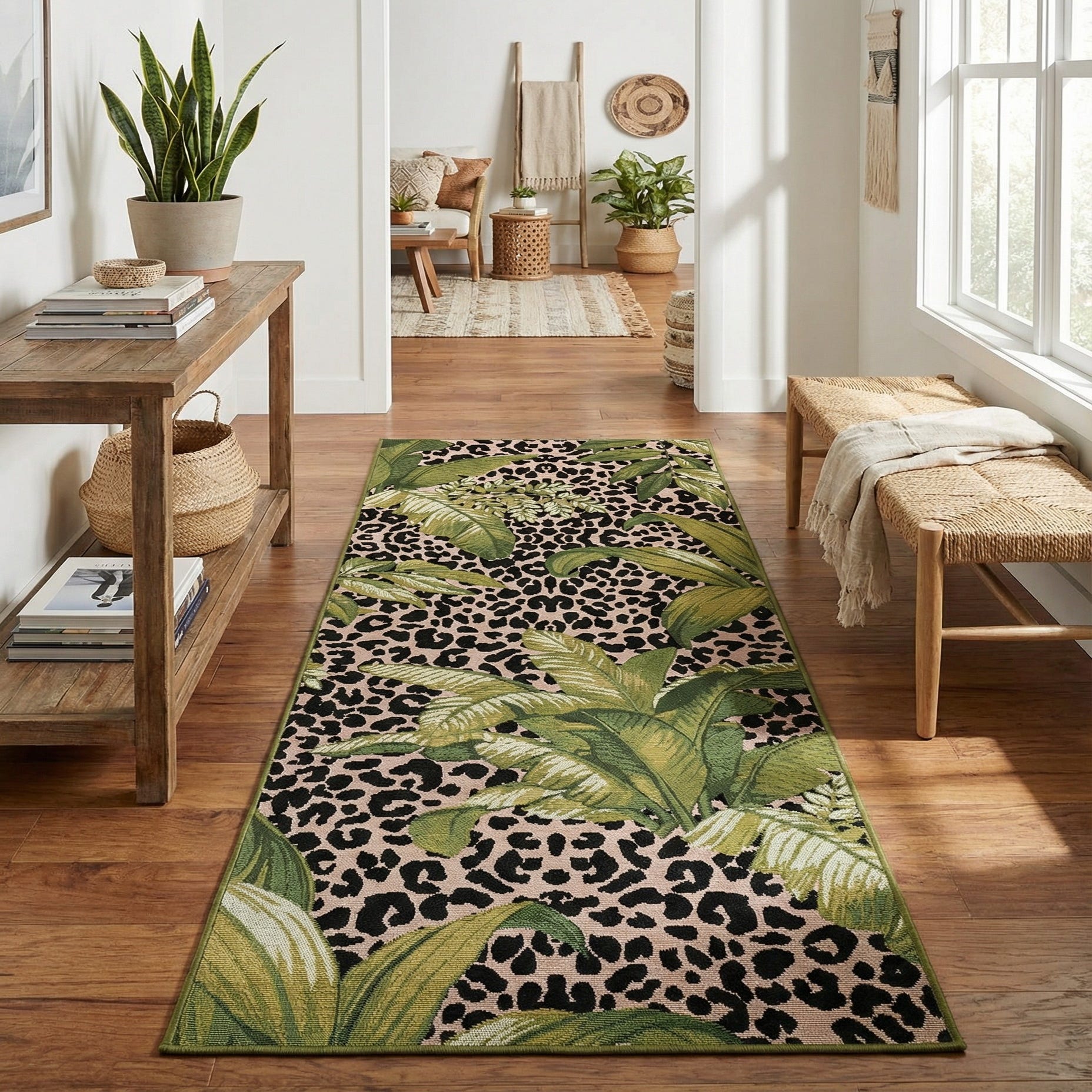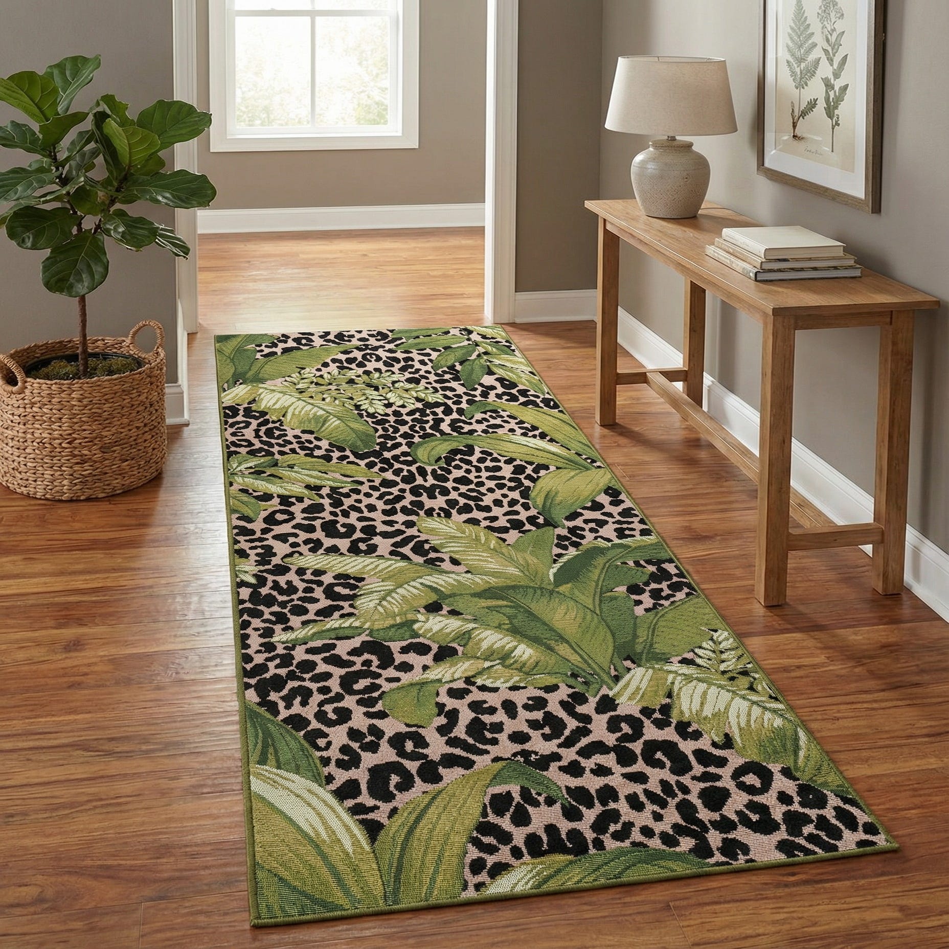 Sized as a runner, it works well in hallways, entryways, covered patios, or sunrooms. Style it with natural materials like teak or rattan, black metal accents and neutral linens to let the pattern stand out, or pair with potted palms and olive-toned textiles for a cohesive tropical look. The mix of green, olive, black and ivory makes it easy to anchor contemporary, eclectic urban, or casual coastal schemes.