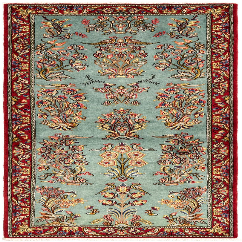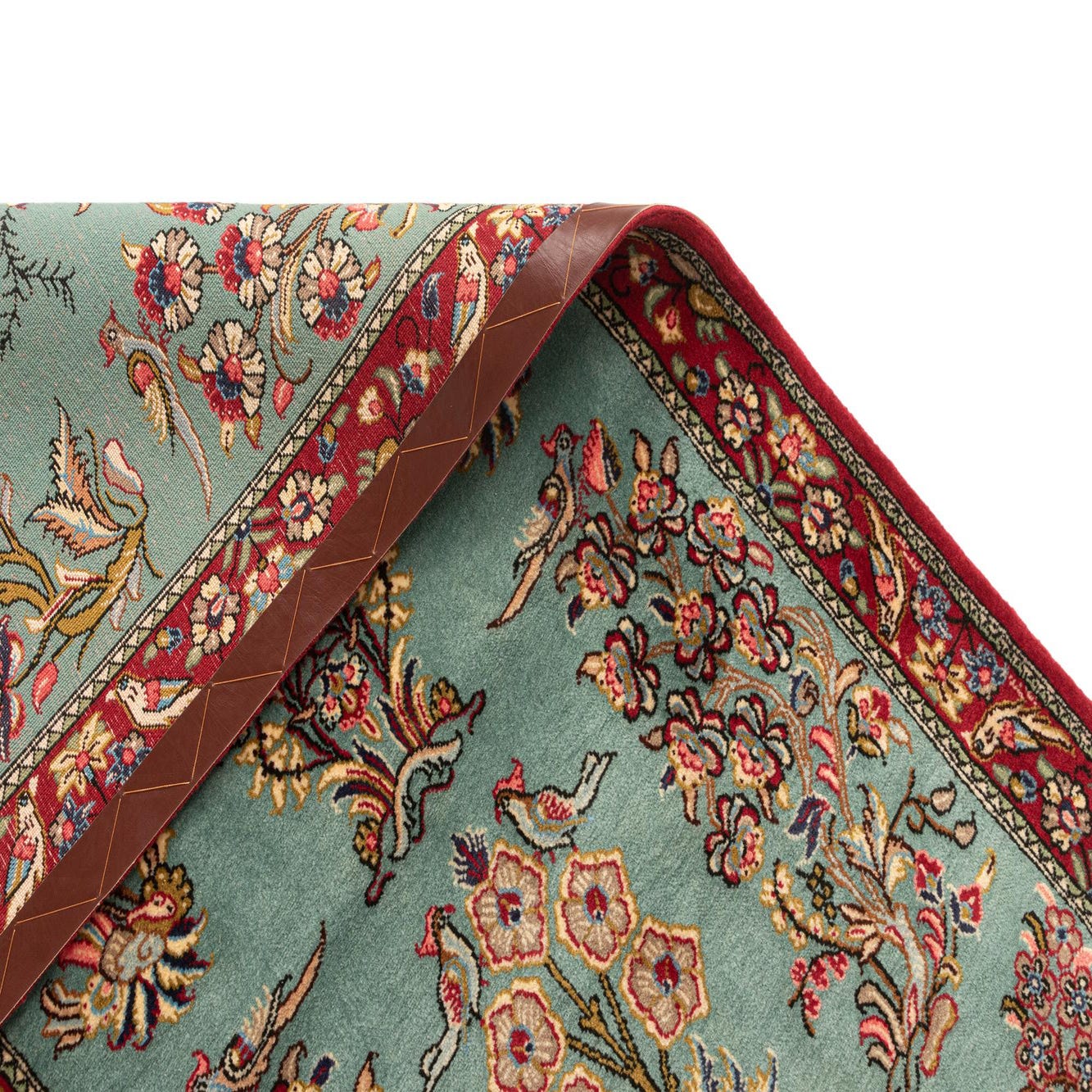 The Ghom collection presents a 7 Ft Runner, handcrafted from wool, showcasing the enduring beauty and precision of traditional rug-making techniques. This runner features a tranquil green background, elegantly contrasted with a symmetrical pattern of floral motifs and avian figures in a rich palette of red, navy, gold, and hints of ivory. The intricate border echoes the central theme, creating a harmonious balance throughout the design.