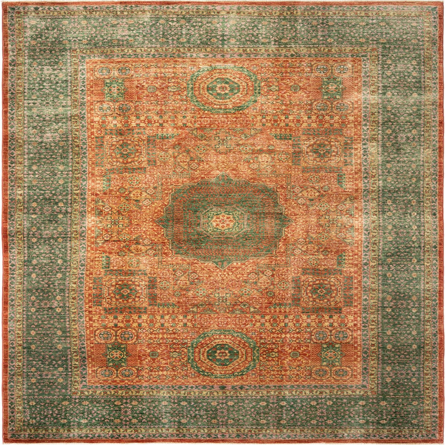 A 7x10 rectangular Amina Persian rug in shades of green and rust orange, featuring intricate traditional patterns.