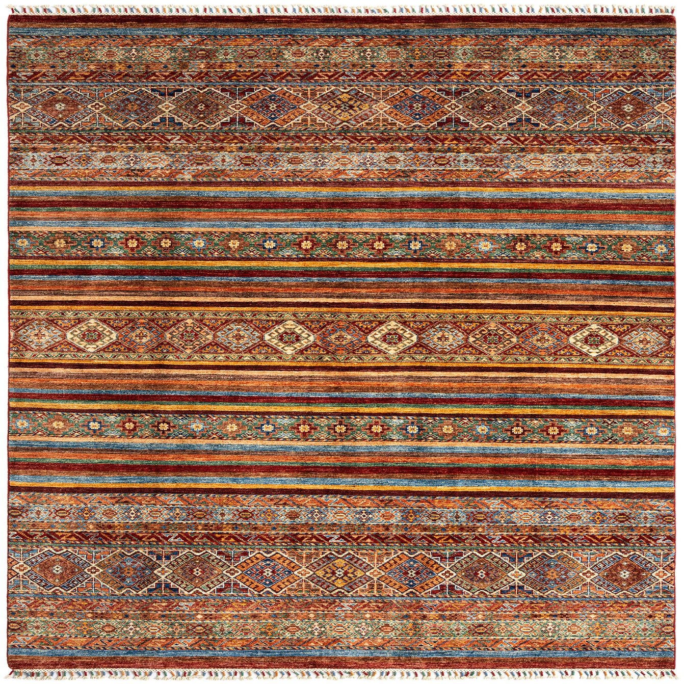 A 7x10 rectangular Ariana Persian wool rug featuring vibrant stripes and intricate geometric patterns in greens, reds, blues, and oranges.