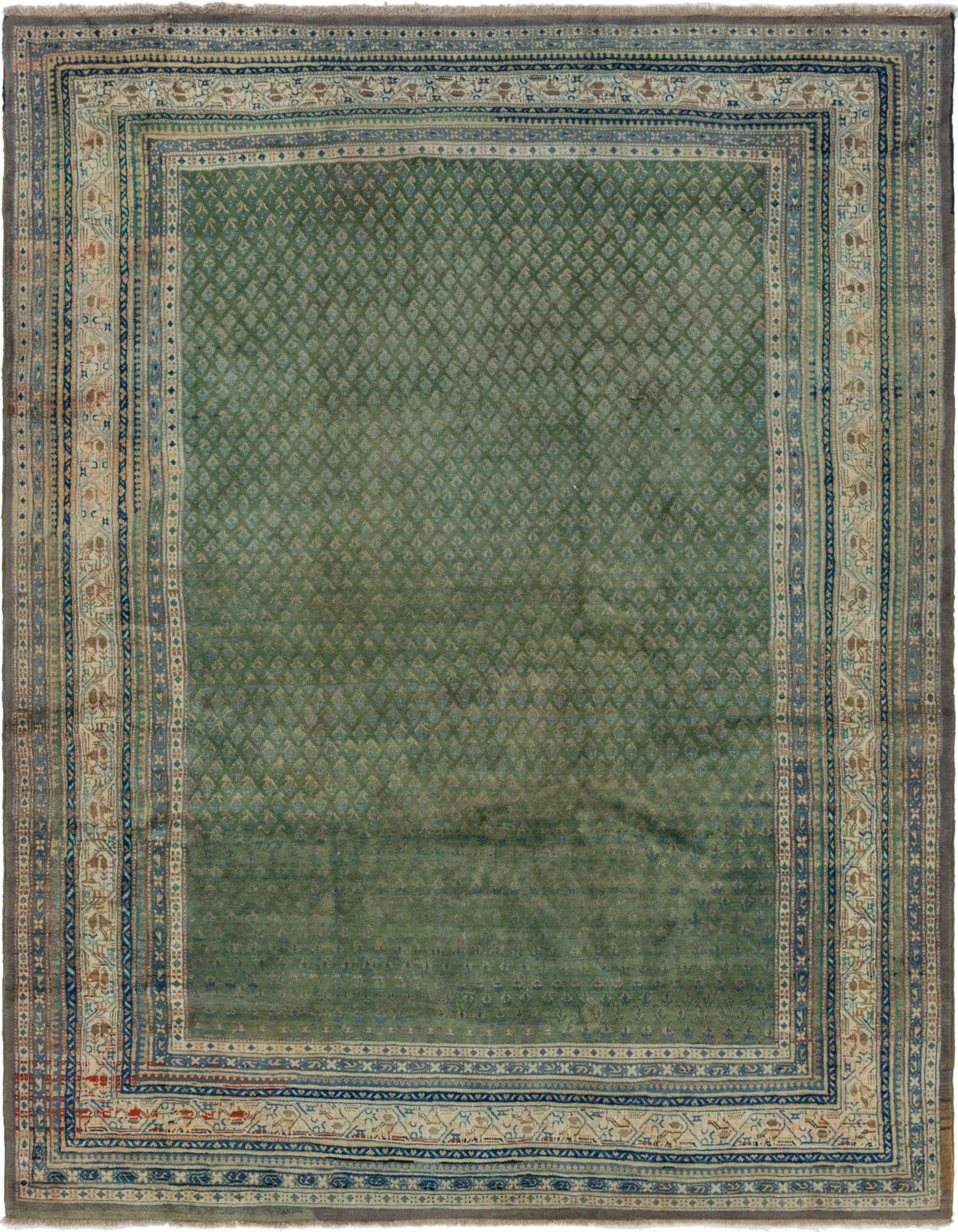 Primary color is Green. Colors in this rug include: Green, Beige, Brown, Blue, Gray, Ivory, Navy Blue.
