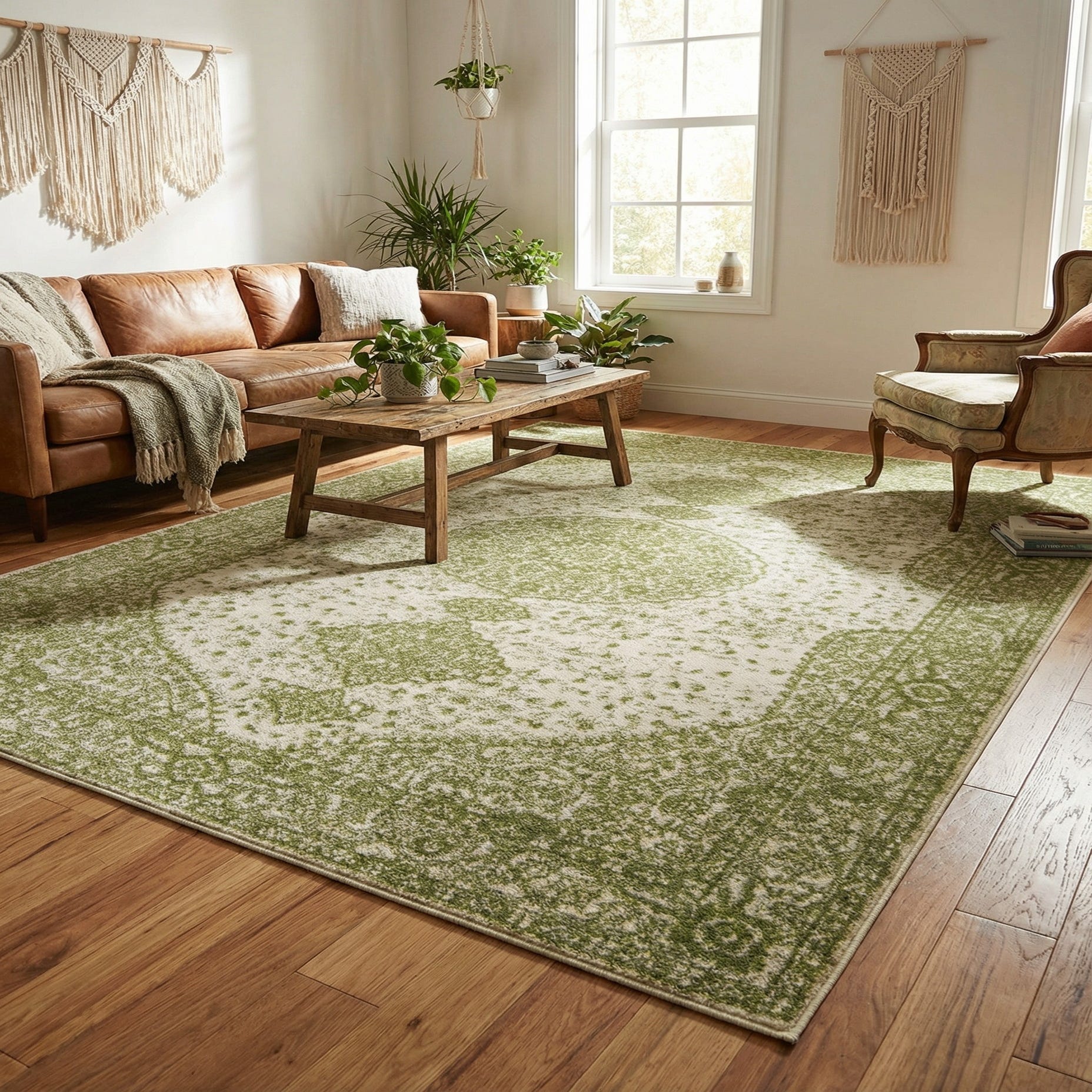 The rug's pattern offers a subtle, distressed look, infusing a sense of gentle sophistication and timeless charm into any living space. The understated color palette can seamlessly integrate into various interior design schemes. The rug's size and serene hues make it an ideal choice for creating a serene anchor in a living room, dining area, or bedroom. Its classic style would harmoniously complement settings that lean towards traditional, transitional, or modern farmhouse aesthetics.