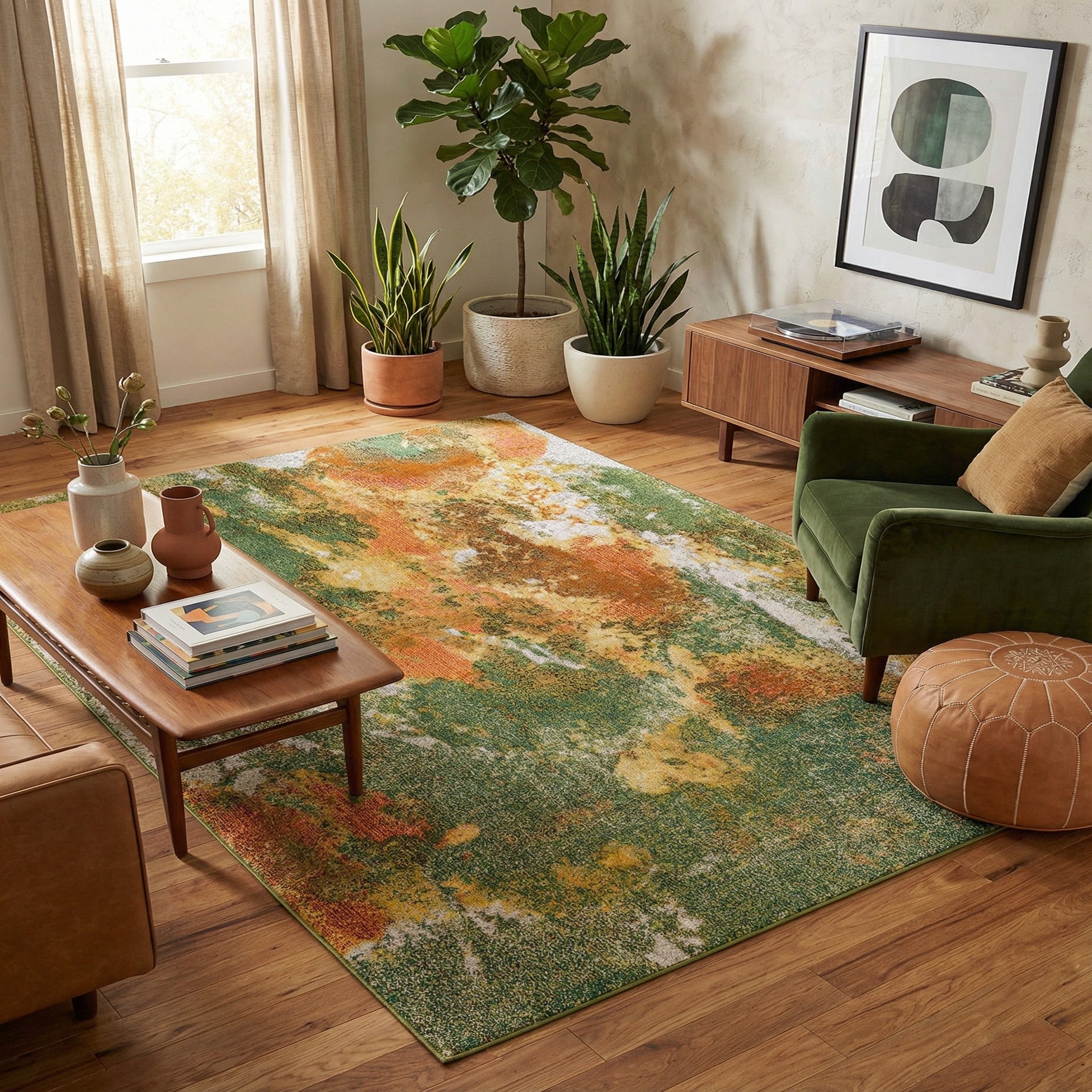 Warm and versatile, this rug pairs well with mid-century modern pieces in walnut or teak, where the green and rust tones complement warm woods and brass accents. It also suits relaxed, layered bohemian or eclectic rooms surrounded by plants and woven textiles, or a modern living area with neutral sofas to anchor brighter pops of color. On hardwood or tile floors it brings color and pattern to an entry, living room or home office while working well beneath a low coffee table or in front of a seating group.