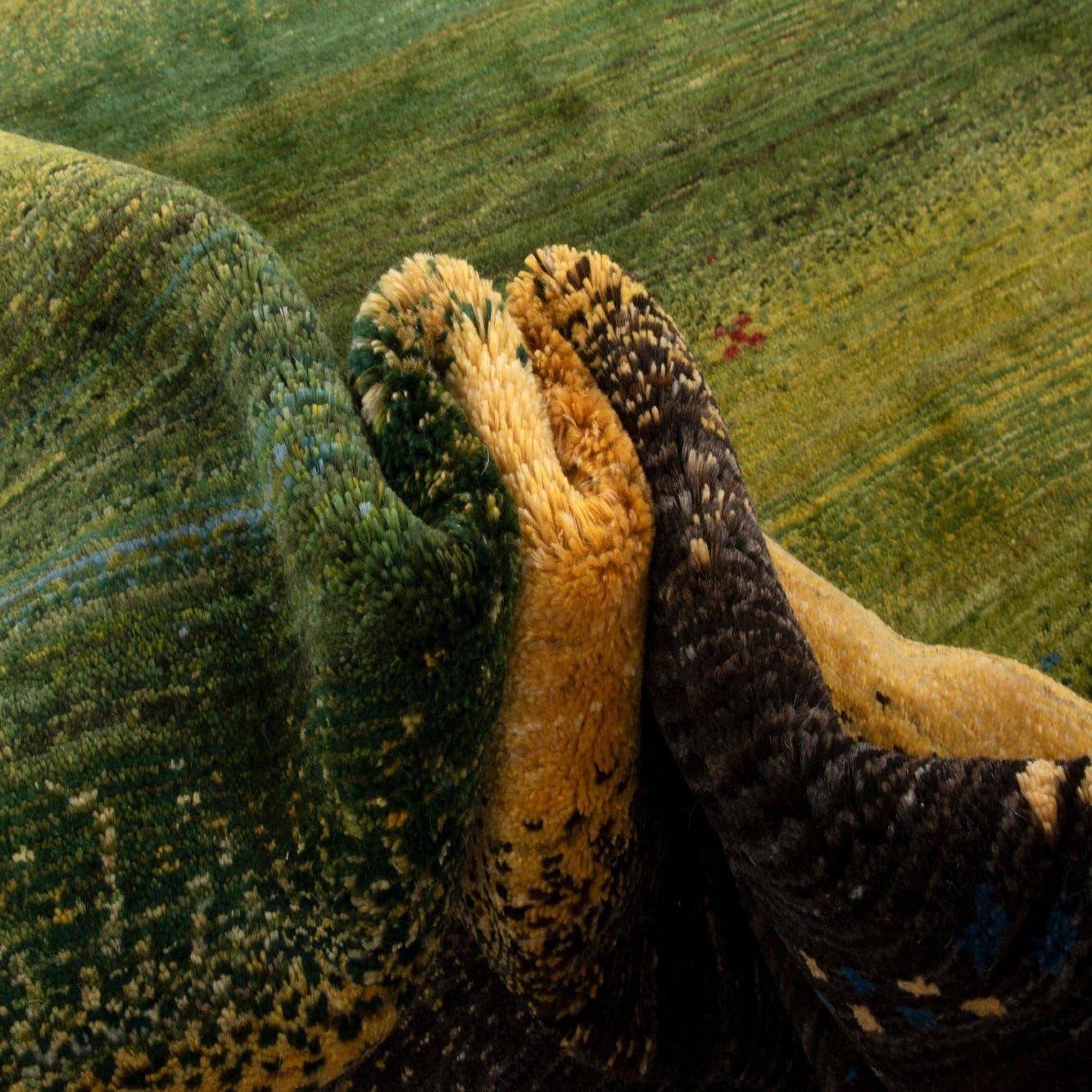 Hand made of 100% wool, this rug presents a broad green field with a gentle ombré that moves from deep forest tones to lighter grassy hues. The central area is calm and open, offset by stacked horizontal bands of blue, golden yellow, cream and rich brown that frame the piece and bring a layered, landscape-like quality. Small, evenly spaced accent dots and tiny geometric marks punctuate the field and borders, giving the rug an artisanal, handwoven character without overwhelming the overall simplicity of the design.