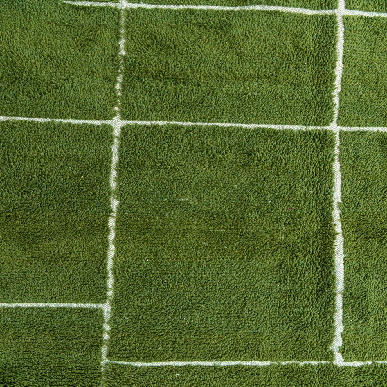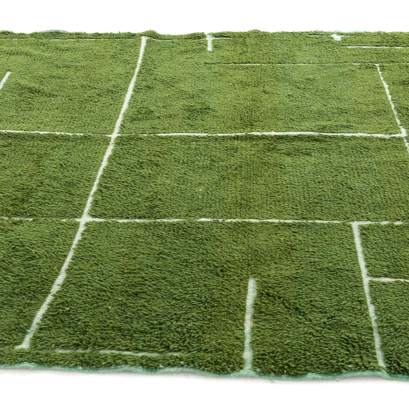A 7x10 rectangular green shag rug with an irregular white grid pattern and fringed ends, suitable for a living room or bedroom.