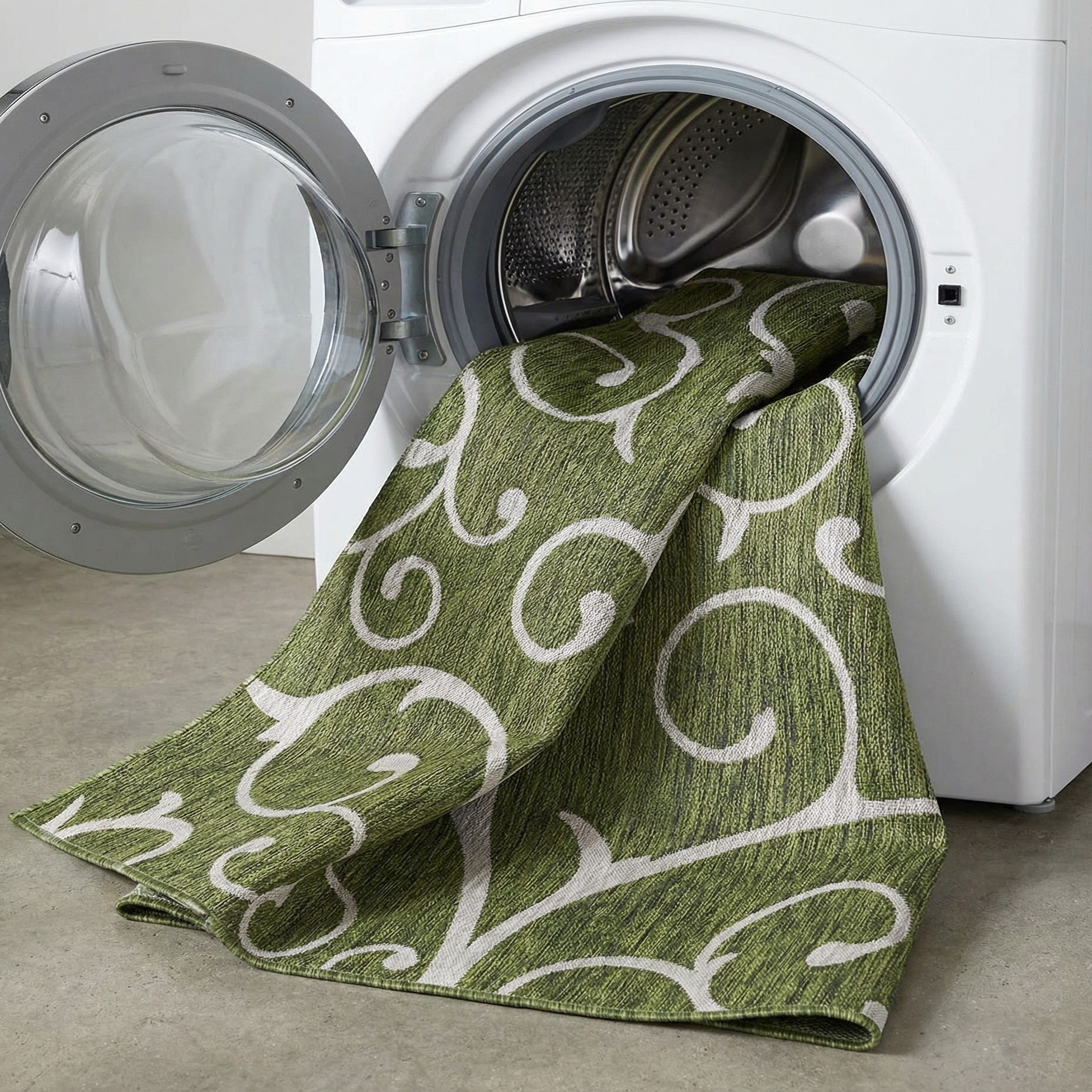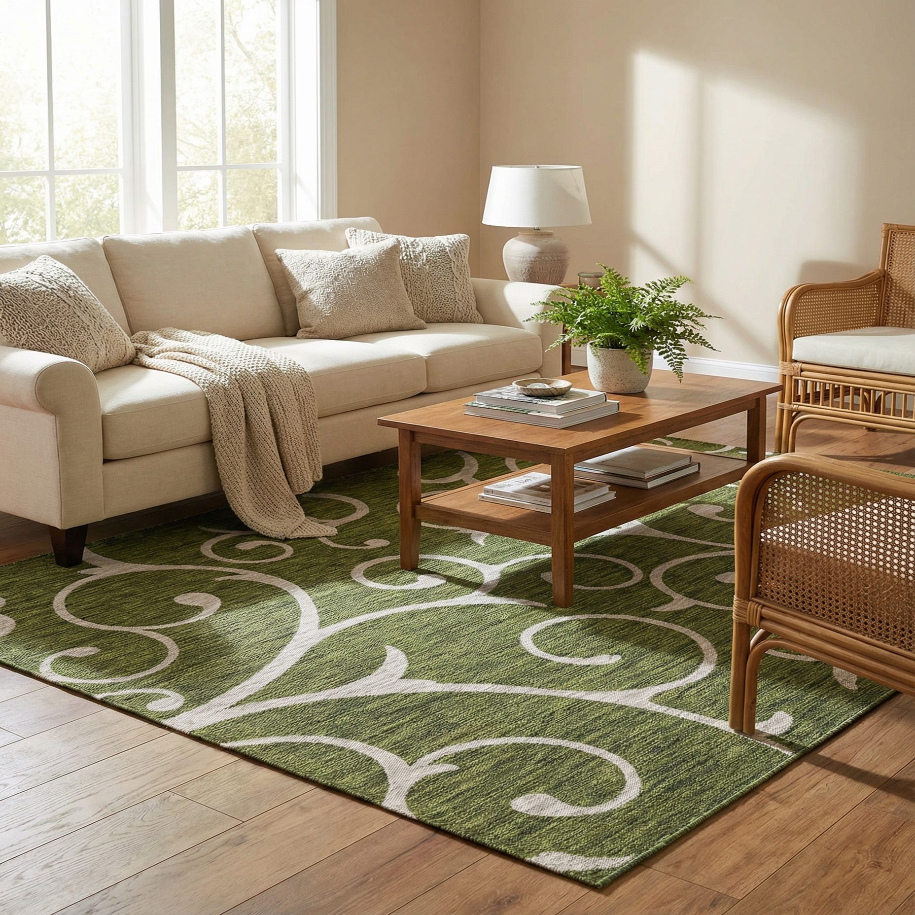 A 7x10 rectangular green indoor/outdoor rug with a white traditional botanical scroll pattern, suitable for a patio or living room.