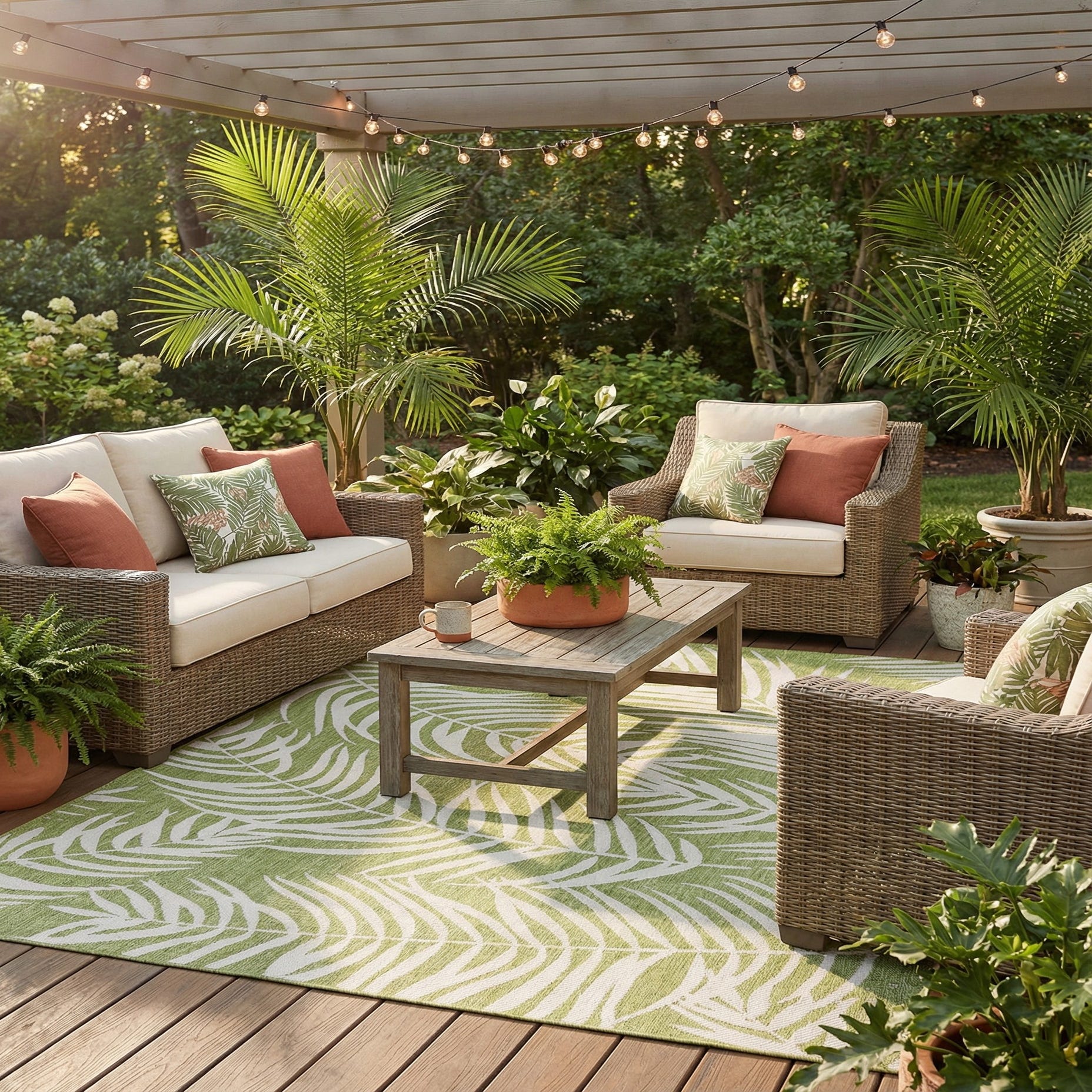 This rug works well on a covered porch or patio, in a sunroom, or under a casual dining table to bring an outdoor vibe indoors. Pair it with light wood or white-washed furniture, woven rattan chairs, and potted greenery for a coastal or tropical-inspired scheme, or use it to soften a modern living room with neutral sofas and natural accents. Its color palette of green and ivory makes it easy to layer with navy or warm tan accessories for added contrast.
