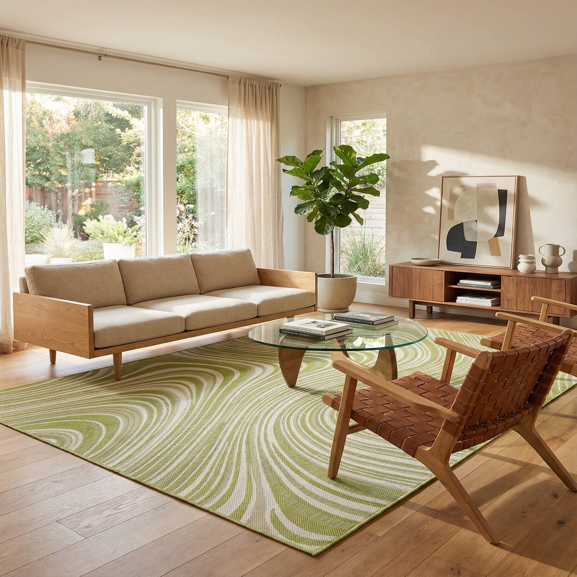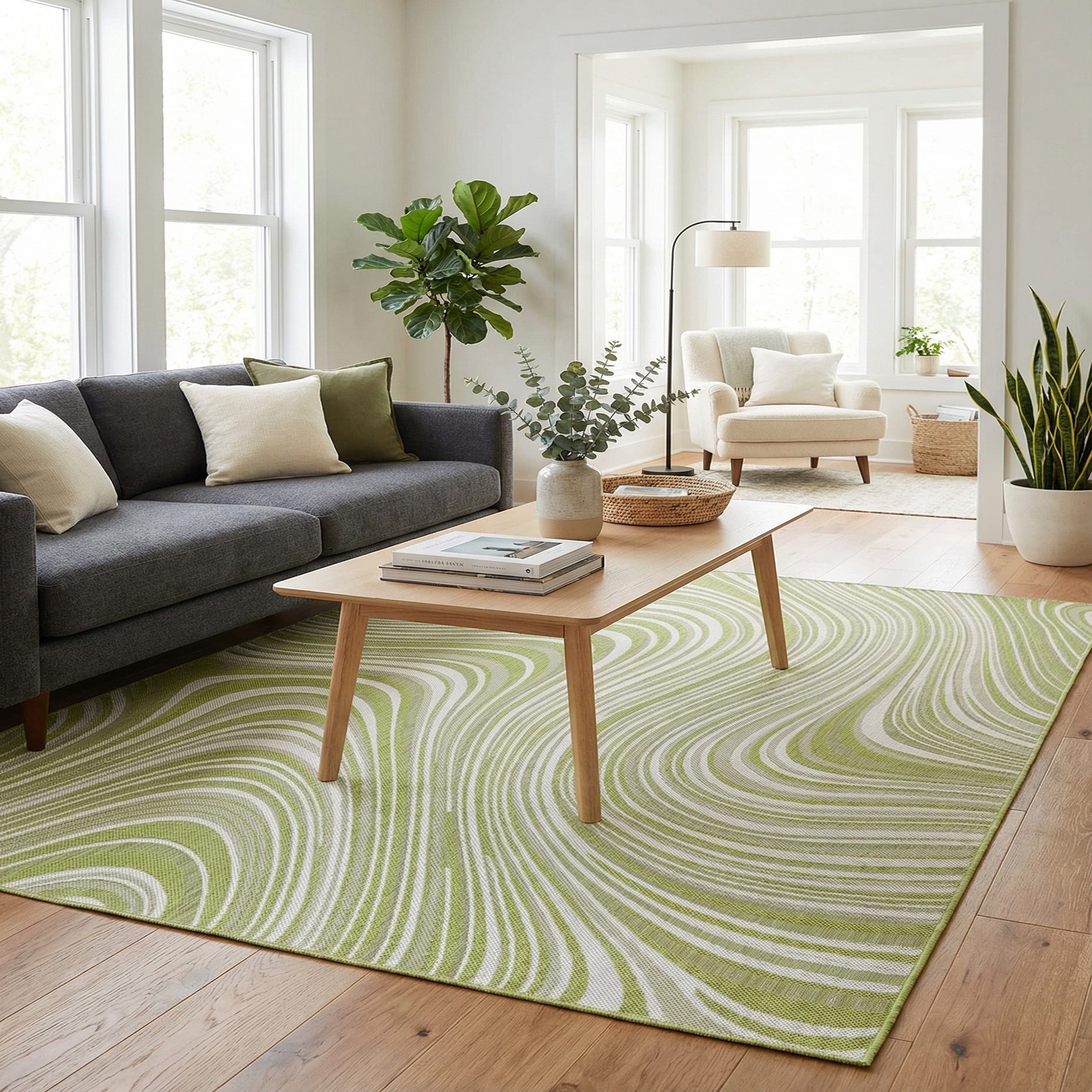This Outdoor Modern collection rug features a captivating, organic wave pattern in a harmonious green and ivory color palette. Its green background is complemented by the ivory detailing that infuses a sense of movement and contemporary style into the design. At 7x10, this machine-woven rug is crafted from 100% polypropylene, ensuring durability and hassle-free maintenance.