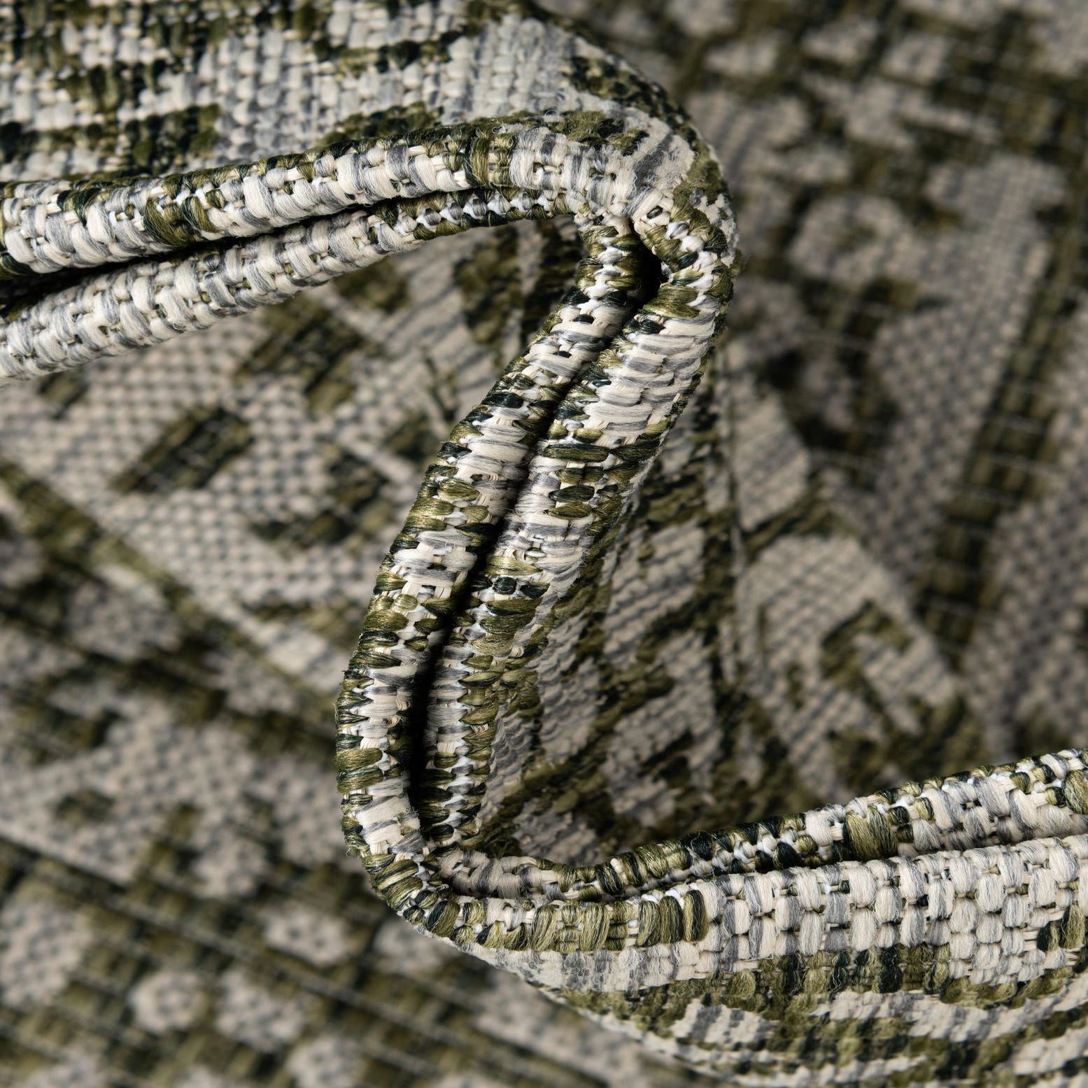 A traditional medallion layout is rendered in a softly distressed gray on a warm green ground, creating an aged, lived-in look without heavy texture. The pattern combines a central ornamental motif with layered borders and floral accents, where the gray highlights sit slightly raised against the green background. Machine made from 100% polypropylene, the rug has a low-profile, flat-woven feel—smooth to the touch with a subtle, grid-like texture that reads as woven rather than plush.