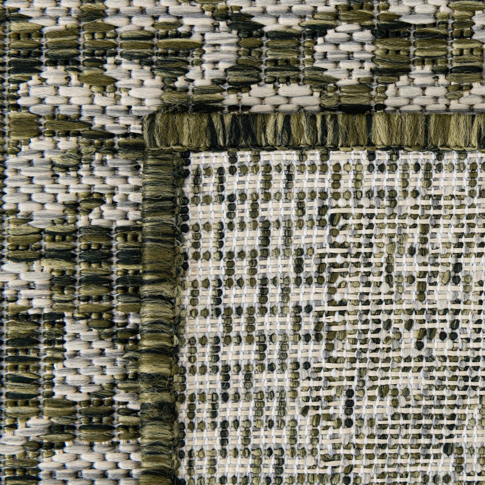 A 7x10 rectangular green and beige Southwestern medallion rug with a flatweave texture, suitable for indoor or outdoor use.