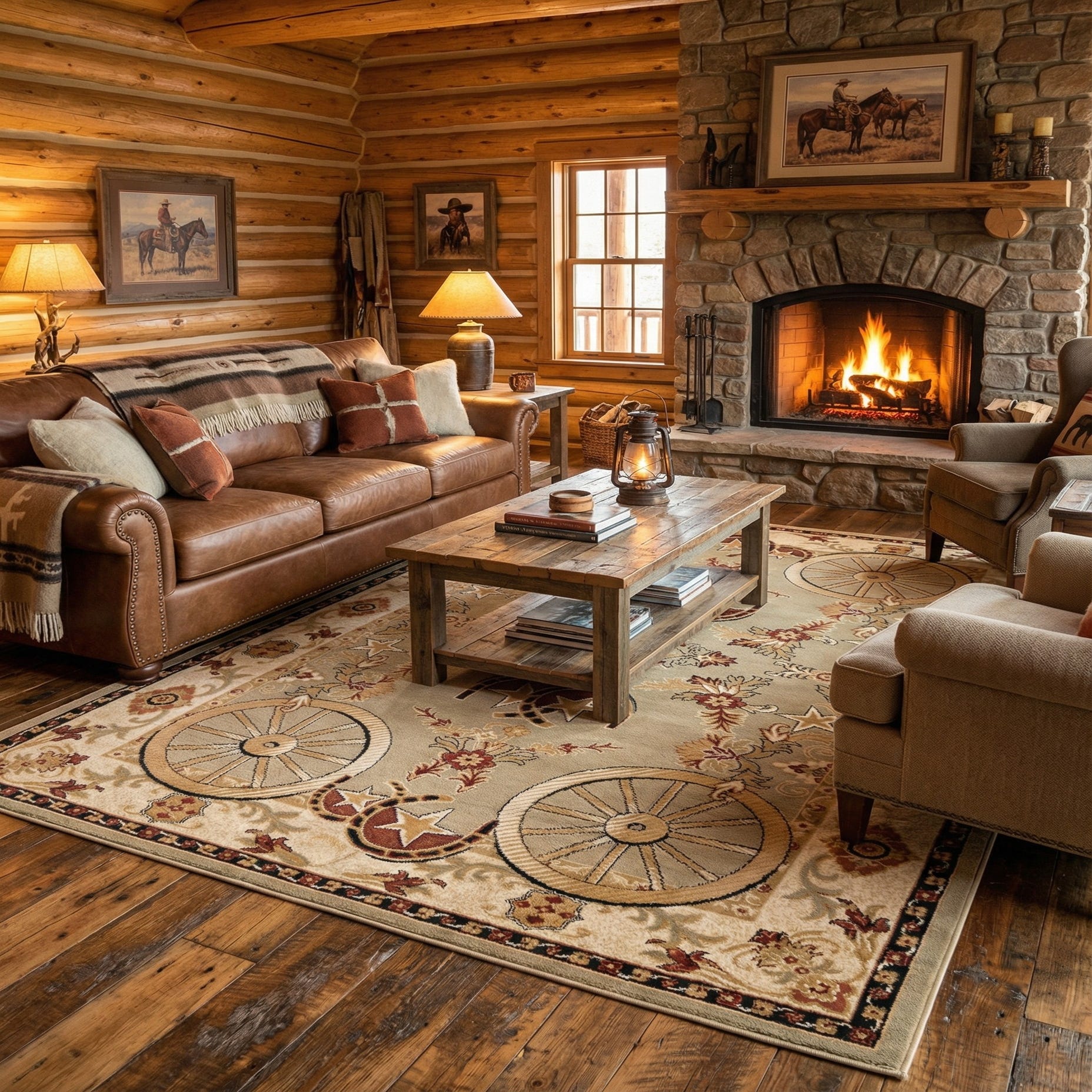 A 7x10 rectangular Pioneer rug featuring a rustic medallion pattern with wagon wheels, horseshoes, and stars in greens, creams, and reds.
