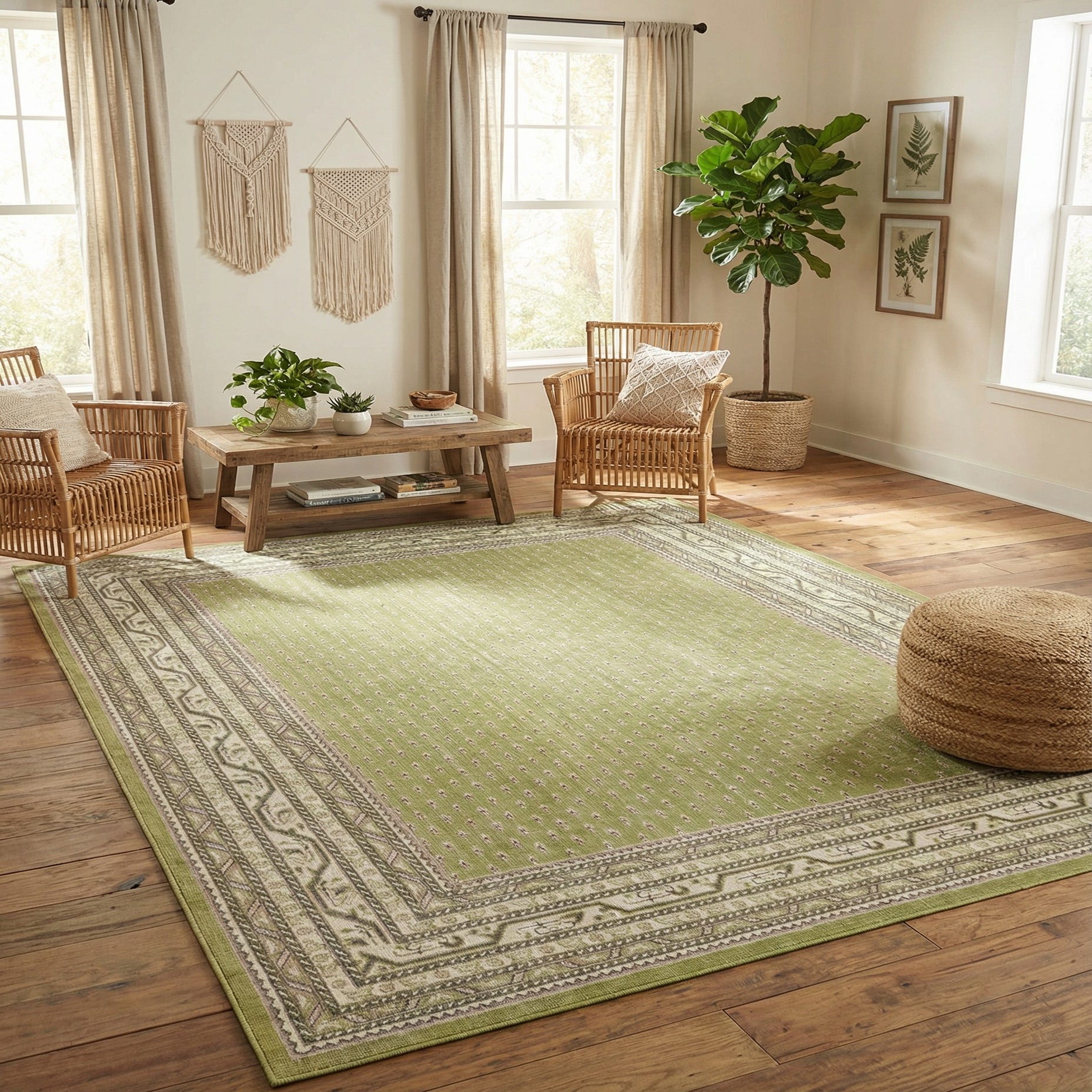 A classic bordered design with a modern color sensibility, this rug places a field of small, evenly spaced teardrop motifs against a green background, surrounded by multiple layered borders in ivory and gray that combine geometric lines and soft vine details. The contrast between the green field and the lighter, patterned border creates a clear frame that draws the eye inward while the repeated motifs add quiet rhythm across the surface. Machine made from 100% polypropylene, the rug has a low, even pile that feels smooth underfoot; running your hand across it you can feel the slight texture where the woven motifs lift against the field, giving the surface subtle dimension without bulk.