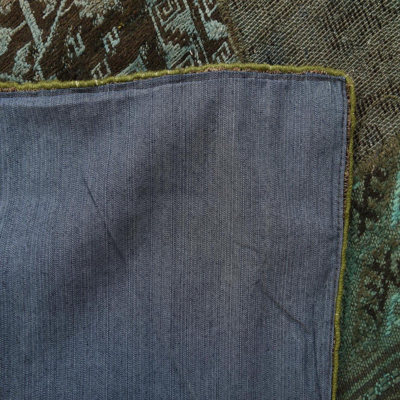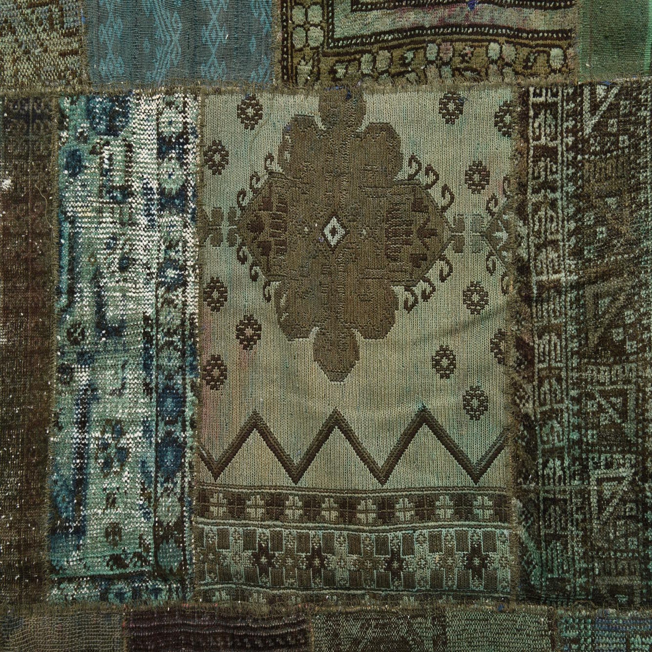 A 7x10 rectangular patchwork rug in various shades of green, featuring distressed Persian and abstract patterns.
